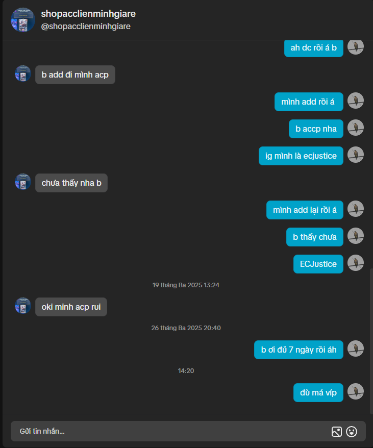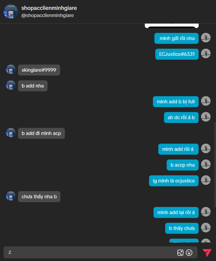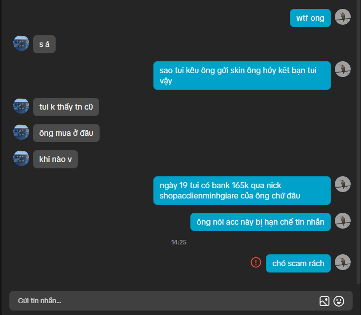 Scam tặng skin giá rẻ, chuyển khoản xong nói đợi 7 ngày nhưng tới 9 10 ngày không có nhắn tin lại hỏi thì bị ăn block, link tiktok nó: https://www.tiktok.com/@skinlienminhgiare