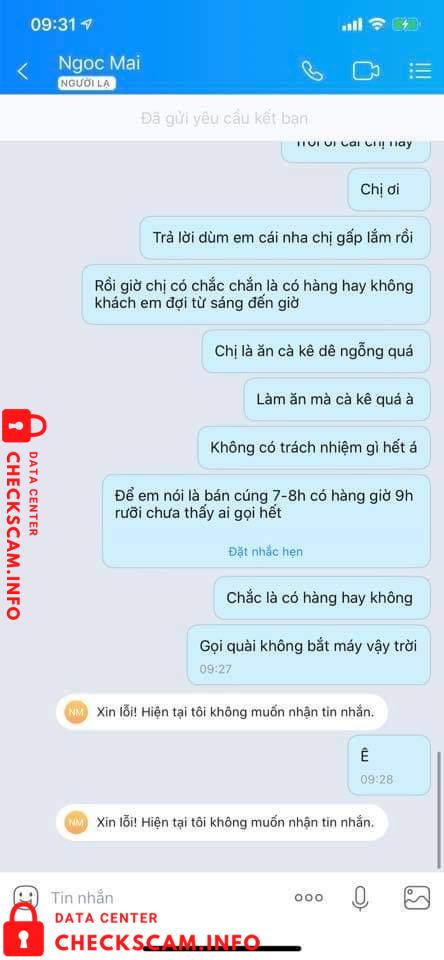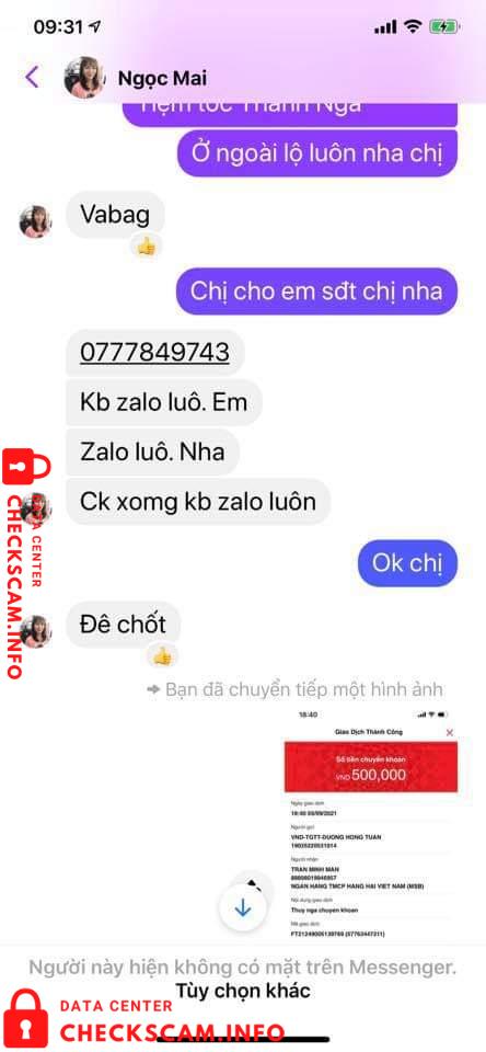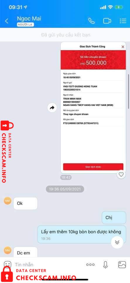 Scammer Alert: Tran Minh Man Reported: November 16, 2024 Scammer Information Full Name: Tran Minh Man Phone Number: 0777849743 Payment Gate: MSB Payment Account: 88898019946957 Category: Marketplace scams Source: Checkscam Evidence Files Report Description Ai có đặt trái cây của con nhỏ này thì tránh xa nó ra Comments Your comment Add Comment No comments yet. Be the first to share your experience with this scammer.