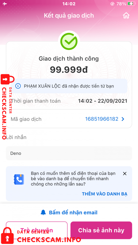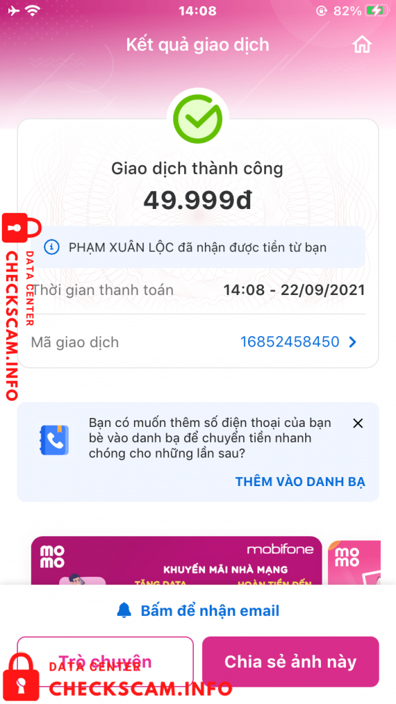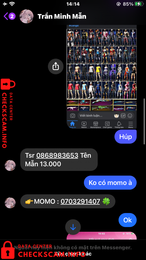Scammer Alert: Trần Minh Mẫn Reported: November 16, 2024 Scammer Information Full Name: Trần Minh Mẫn Phone Number: 0868983653 Payment Gate: Momo + tsr Category: Marketplace scams Source: Checkscam Evidence Files Report Description Scam bán acc ff Comments Your comment Add Comment No comments yet. Be the first to share your experience with this scammer.