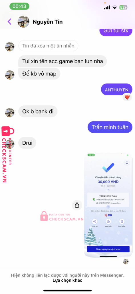 Scammer Alert: Tran Minh Tuan Reported: March 7, 2025 Scammer Information Full Name: Tran Minh Tuan Payment Gate: Vietcombank Payment Account: 9764102154 Category: Marketplace scams Source: Checkscam Evidence Files Report Description Comments Your comment Add Comment No comments yet. Be the first to share your experience with this scammer.