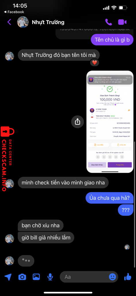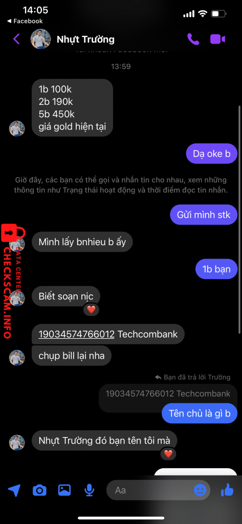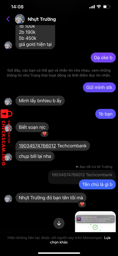 Scammer Alert: Tran Nhut Truong Reported: November 16, 2024 Scammer Information Full Name: Tran Nhut Truong Payment Gate: Techcombank Payment Account: 19034574766012 Category: Marketplace scams Source: Checkscam Evidence Files Report Description Lừa bán gold game chặt heo Comments Your comment Add Comment No comments yet. Be the first to share your experience with this scammer.