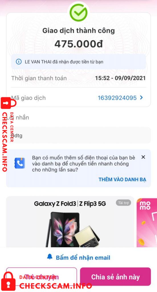Scammer Alert: Tran Phuoc Lanh Reported: November 16, 2024 Scammer Information Full Name: Tran Phuoc Lanh Phone Number: 0907633247 Payment Gate: MB Payment Account: 9999123456321 Category: Marketplace scams Source: Checkscam Evidence Files Report Description Lừa đảo bán acc fb 470k nhưng không có giao acc làm mất 5k phí gdtg, sau đó tiếp tục lập nick zalo fake Nguyễn Hoàng Dương để add nhận gdtg nick đó 470k tiếp nhưng đã bị phát hiện và tố cáo.. Tk: Momo scam: 0907633247 – Nguyễn Hoàng Hyn TK: Mbbank scam: 9999123456321 – TRAN PHUOC LANH Comments Your comment Add Comment No comments yet. Be the first to share your experience with this scammer.