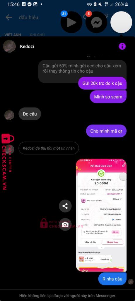Scammer Alert: Trần Quang Hải Reported: November 16, 2024 Scammer Information Full Name: Trần Quang Hải Payment Gate: Momo Payment Account: 0343280438 Category: Marketplace scams Source: Checkscam Evidence Files Report Description Lừa mua bán nick Comments Your comment Add Comment No comments yet. Be the first to share your experience with this scammer.