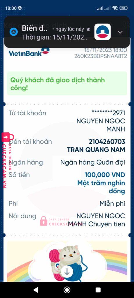 Scammer Alert: TRAN QUANG NAM Reported: November 16, 2024 Scammer Information Full Name: TRAN QUANG NAM Payment Gate: Mbbank Payment Account: 2104260703 Category: Marketplace scams Source: Checkscam Evidence Files Report Description Scam tiền Comments Your comment Add Comment No comments yet. Be the first to share your experience with this scammer.