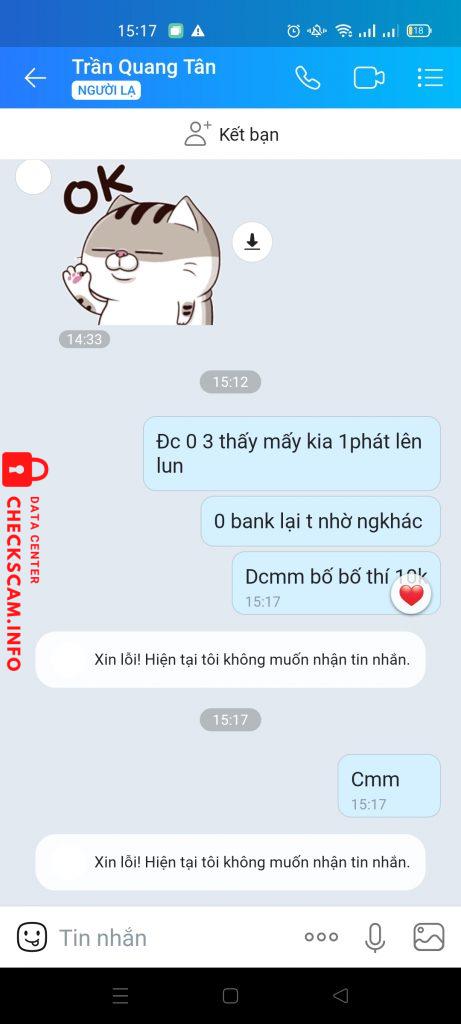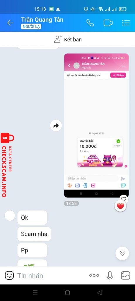 Scammer Alert: Trần Quang Tân Reported: November 16, 2024 Scammer Information Full Name: Trần Quang Tân Phone Number: 0328201132 Payment Gate: Momo Payment Account: 0328201132 Category: Marketplace scams Source: Checkscam Evidence Files Report Description Bank tiền xong block Comments Your comment Add Comment No comments yet. Be the first to share your experience with this scammer.