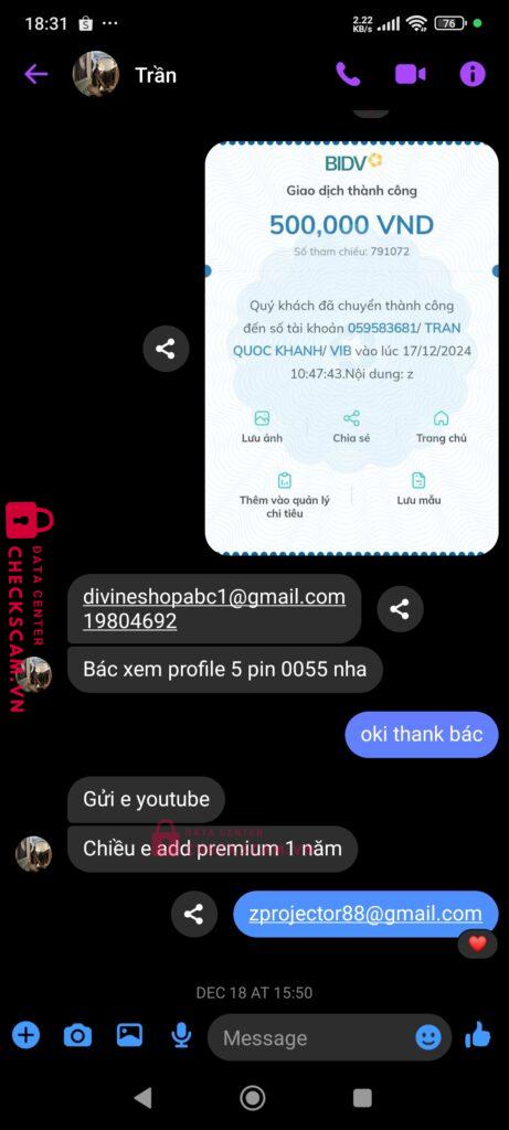 Scammer Alert: Trần Quốc Khánh Reported: March 7, 2025 Scammer Information Full Name: Trần Quốc Khánh Payment Gate: VIB Payment Account: 059583681 Category: Marketplace scams Source: Checkscam Evidence Files Report Description Lừa scam bán netflix 1 năm Comments Your comment Add Comment No comments yet. Be the first to share your experience with this scammer.