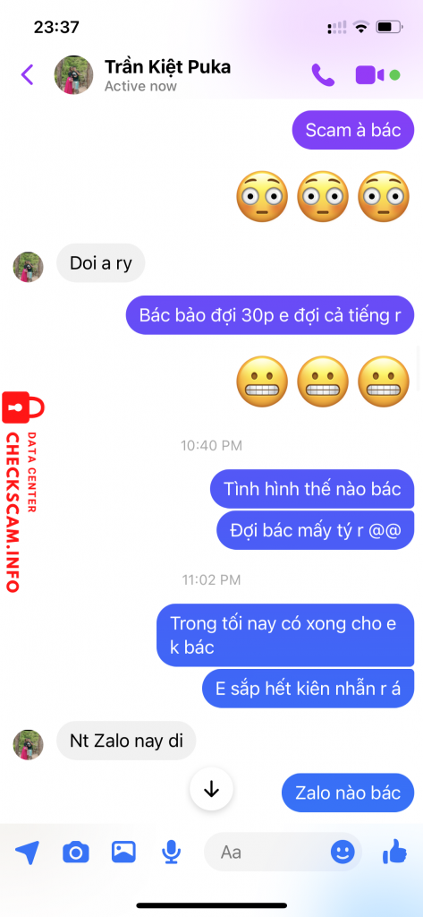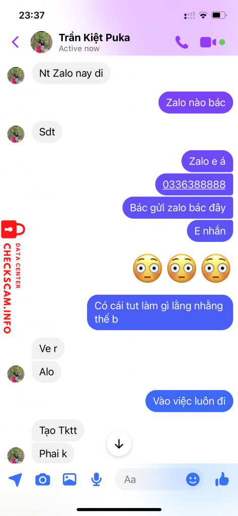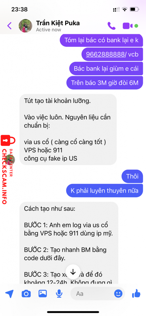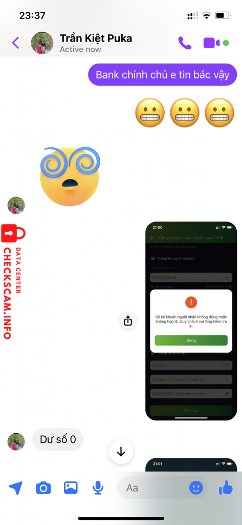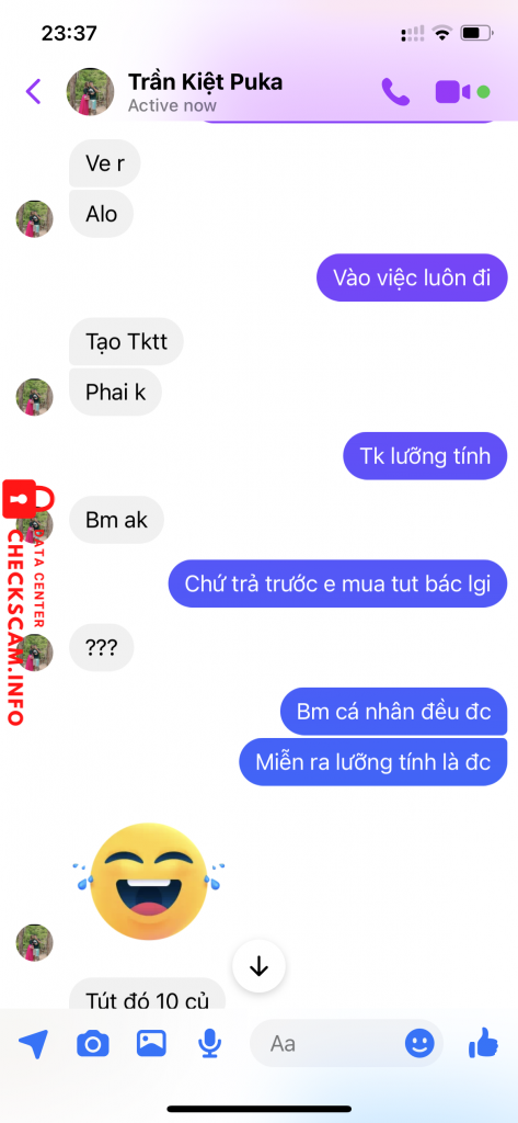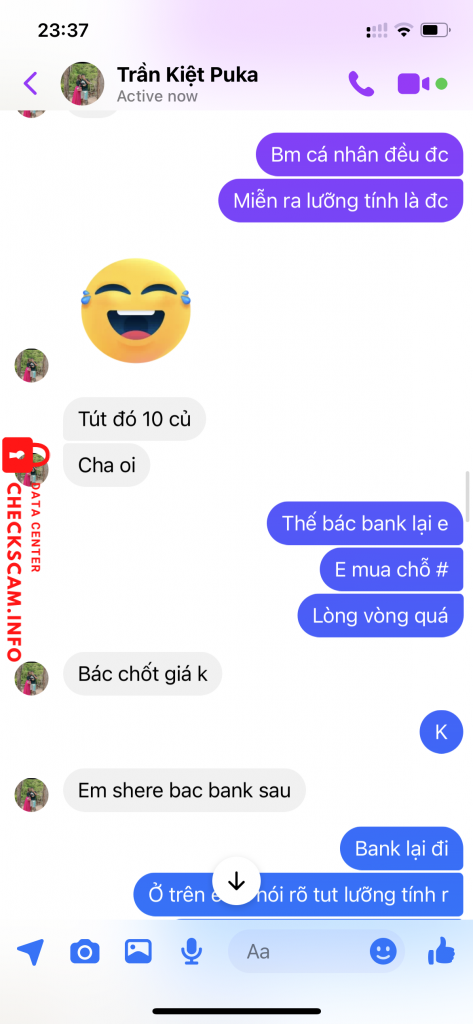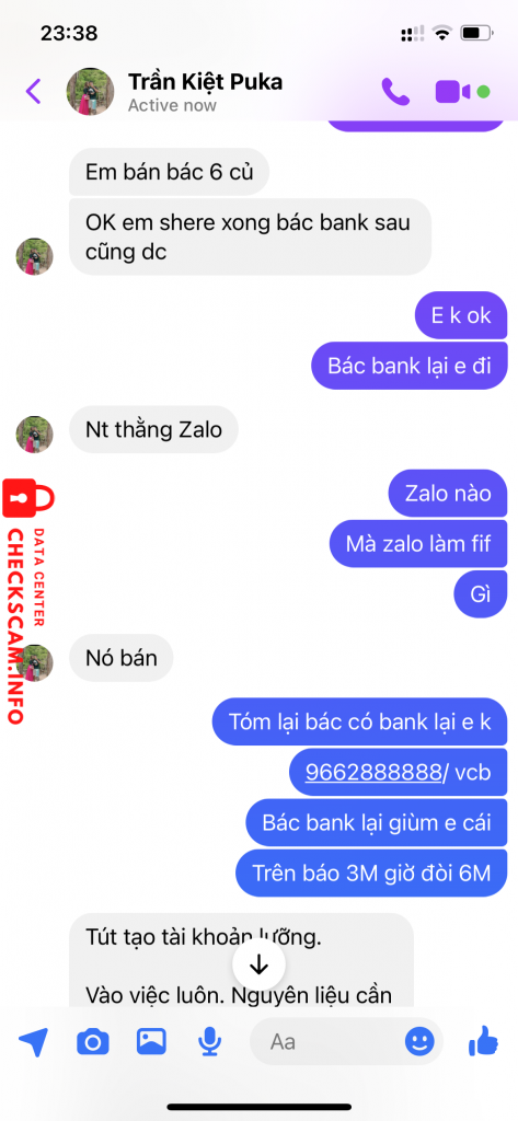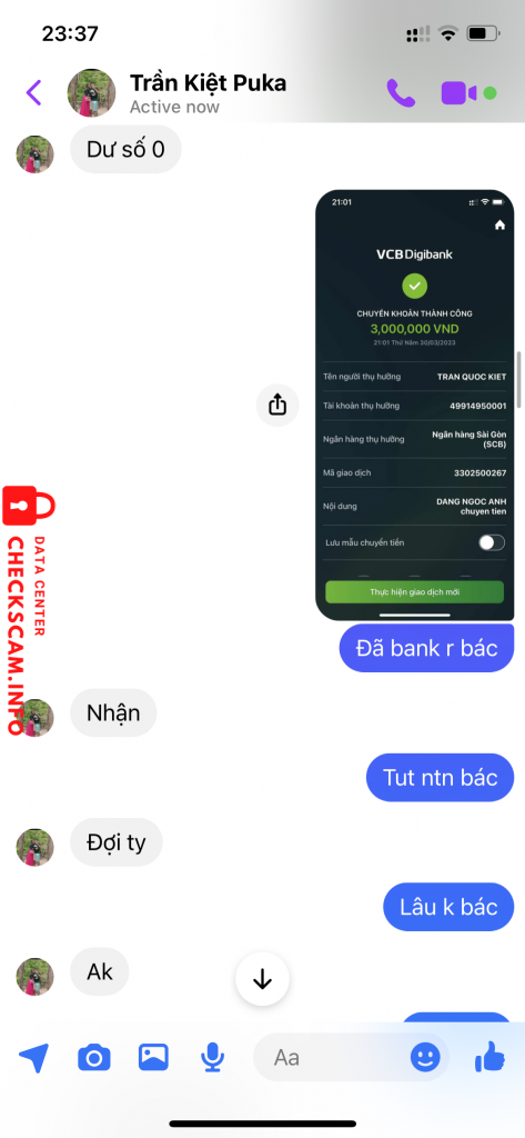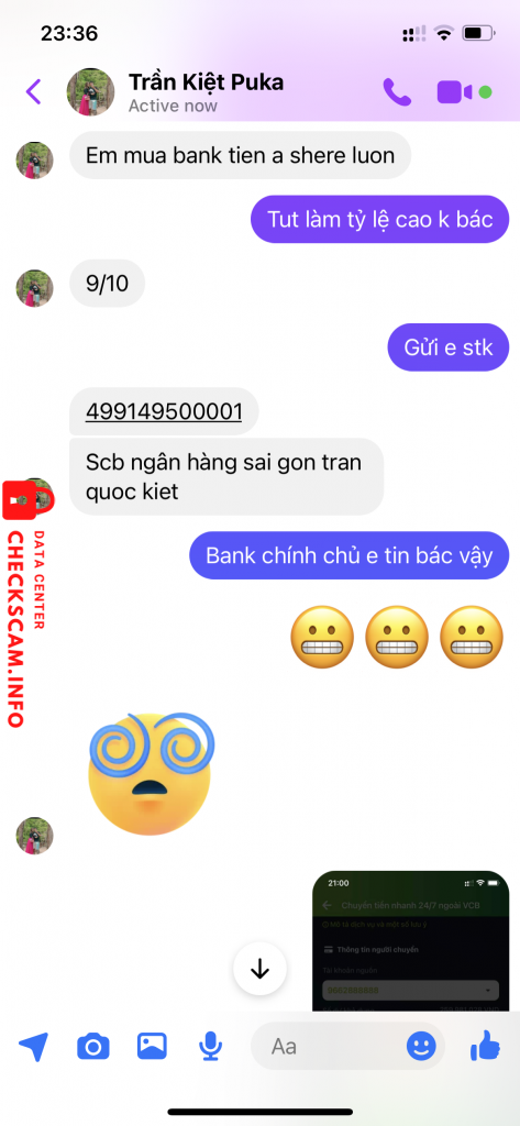 Scammer Alert: Trần quốc kiệt Reported: November 16, 2024 Scammer Information Full Name: Trần quốc kiệt Payment Gate: SCB - ngân hàng sài gòn Payment Account: 49914950001 Category: Marketplace scams Source: Checkscam Evidence Files Report Description Bán tút luỡng tính 3M giả vờ bận đến lúc mình làm căng thì loanh quanh đòi bank thêm mới bán. Comments Your comment Add Comment No comments yet. Be the first to share your experience with this scammer.