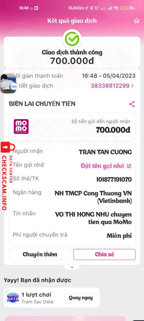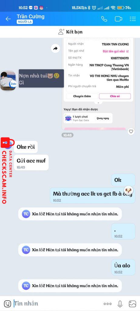 Scammer Alert: Trần Tấn Cường Reported: November 16, 2024 Scammer Information Full Name: Trần Tấn Cường Payment Gate: Vietinbank Payment Account: 101877191070 Category: Marketplace scams Source: Checkscam Evidence Files Report Description Lừa đảo tiền hack pubg 700k Comments Your comment Add Comment No comments yet. Be the first to share your experience with this scammer.