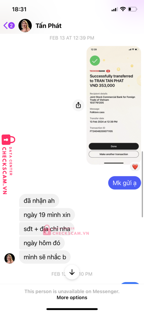 Scammer Alert: Trần Tấn Phát Reported: November 16, 2024 Scammer Information Full Name: Trần Tấn Phát Payment Gate: Vietcombank Payment Account: 1037761205 Category: Marketplace scams Source: Checkscam Evidence Files Report Description Tôi hỏi mua đĩa nhạc của tên này và đã chuyển tiền đầy đủ, sau vài ngày thì nó đã chặn tôi trên fb Comments Your comment Add Comment No comments yet. Be the first to share your experience with this scammer.