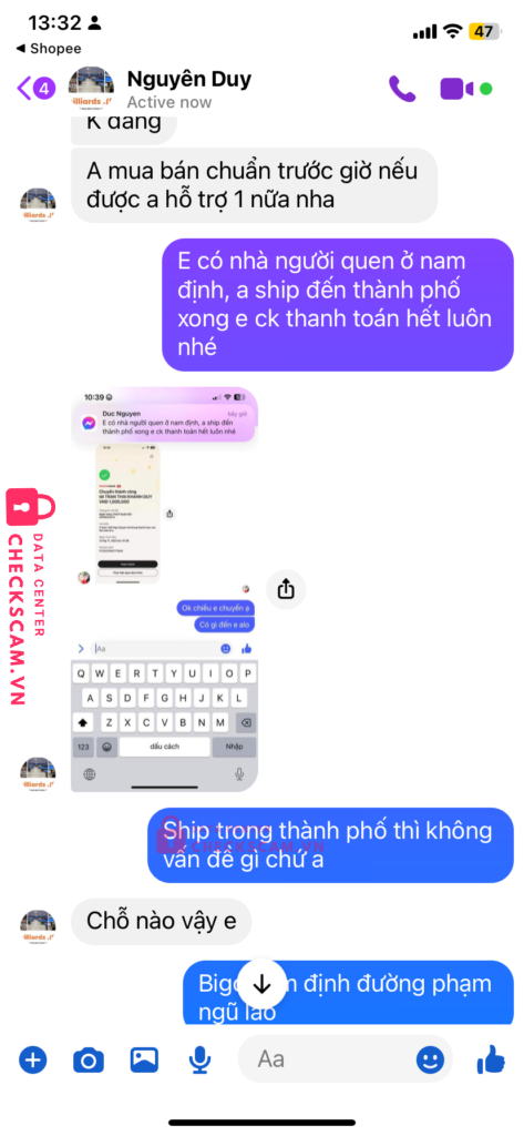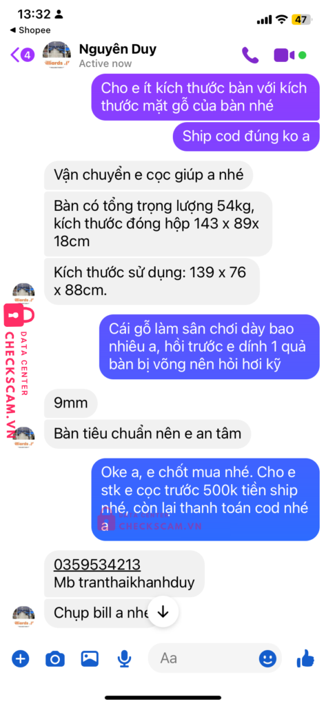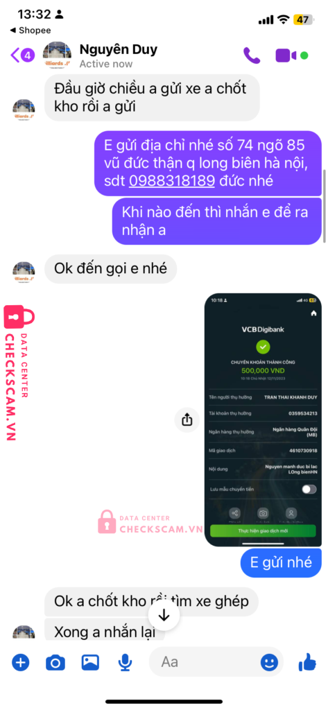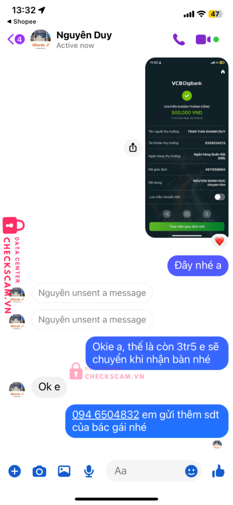 Scammer Alert: Tran thai khanh duy Reported: November 16, 2024 Scammer Information Full Name: Tran thai khanh duy Payment Gate: MB Payment Account: 0359534213 Category: Marketplace scams Source: Checkscam Evidence Files Report Description Lừa đảo cọc và xoá tin nhắn sau khi nhận chuyển khoản cọc Comments Your comment Add Comment No comments yet. Be the first to share your experience with this scammer.