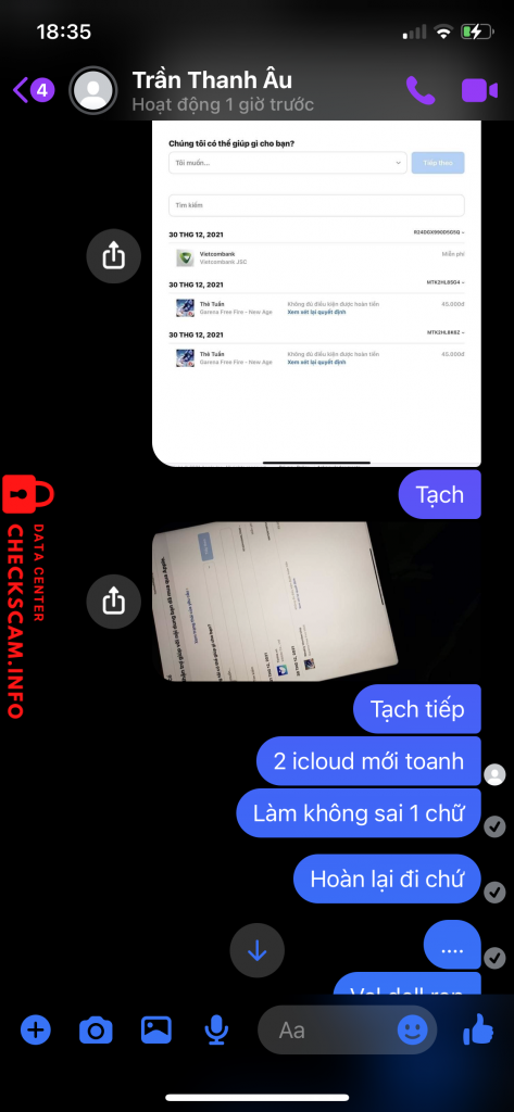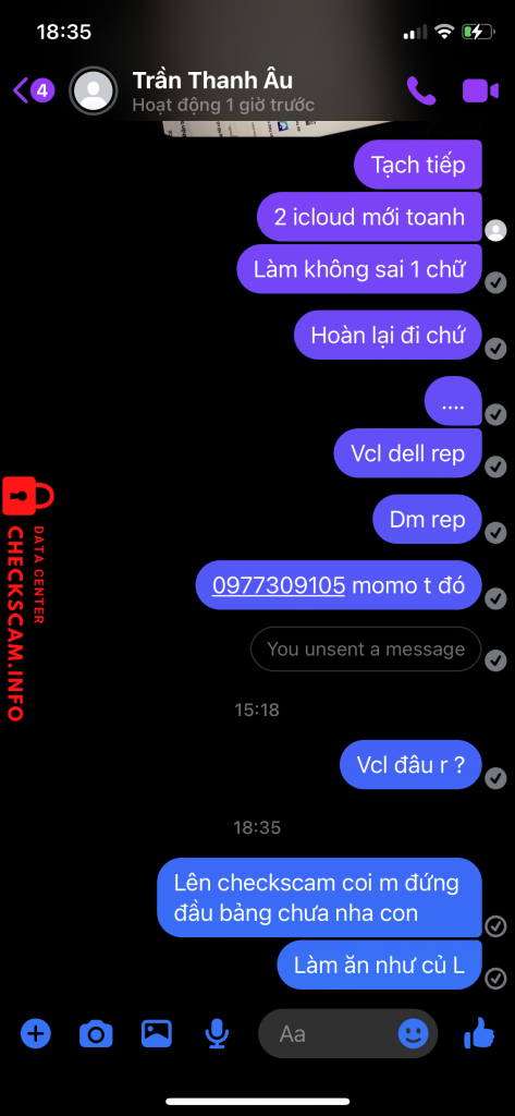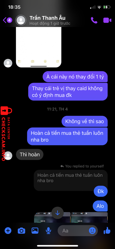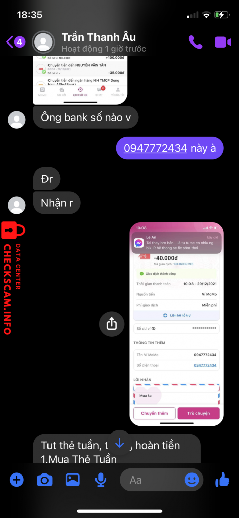Scammer Alert: Trần Thanh Âu Reported: November 16, 2024 Scammer Information Full Name: Trần Thanh Âu Phone Number: 0947772434 Payment Gate: Mbbank Payment Account: 1913667898888 Category: Marketplace scams Source: Checkscam Evidence Files Report Description Bán tut thẻ tuần bao hoàn mà đến lúc tạch thì nhắn tin không rep Comments Your comment Add Comment No comments yet. Be the first to share your experience with this scammer.