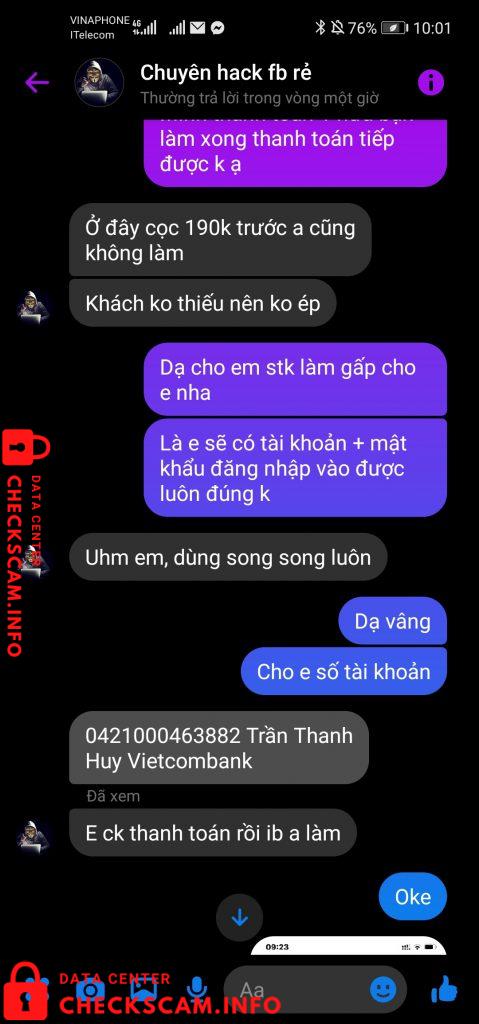 Scammer Alert: Tran Thanh Huy Reported: November 16, 2024 Scammer Information Full Name: Tran Thanh Huy Payment Gate: Vietcombank Payment Account: 0421000463882 Category: Marketplace scams Source: Checkscam Evidence Files Report Description Lừa đảo chiếm đoạt tài sản Mong cơ quan chức năng vào cuộc xử lí Comments Your comment Add Comment No comments yet. Be the first to share your experience with this scammer.