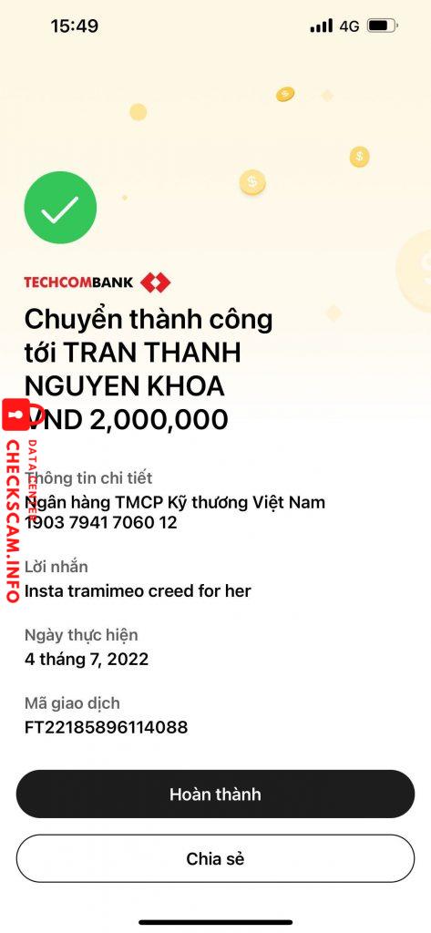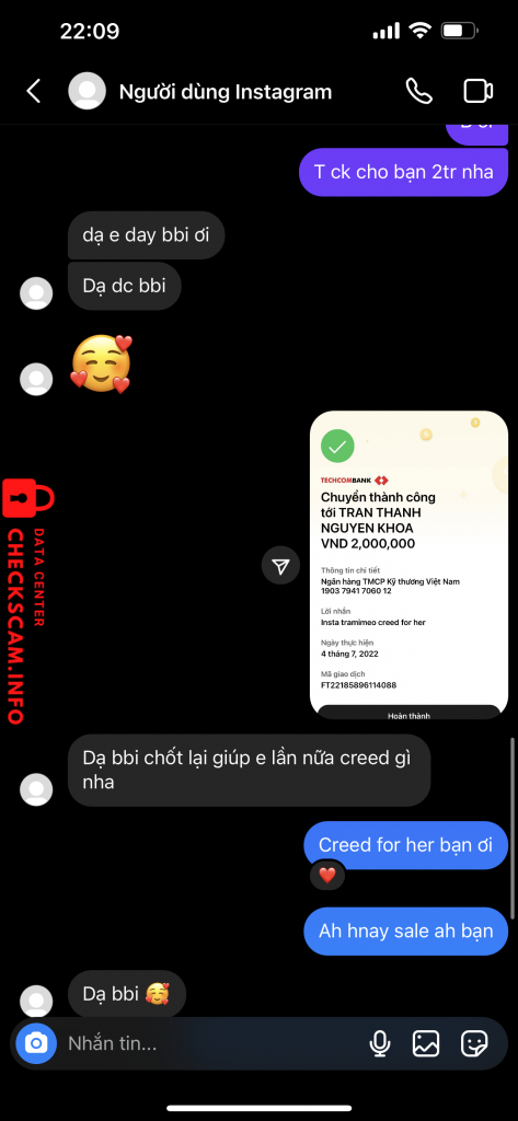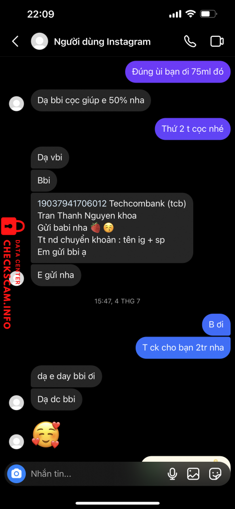 Scammer Alert: Tran Thanh Nguyen Khoa Reported: November 16, 2024 Scammer Information Full Name: Tran Thanh Nguyen Khoa Payment Gate: Techcombank Payment Account: 19037941706012 Category: Marketplace scams Source: Checkscam Evidence Files Report Description Mình có order lọ nước hoa, hẹn đến nay 2 tháng, chưa kịp ới shop đã thấy bị khoá insta Comments Your comment Add Comment No comments yet. Be the first to share your experience with this scammer.