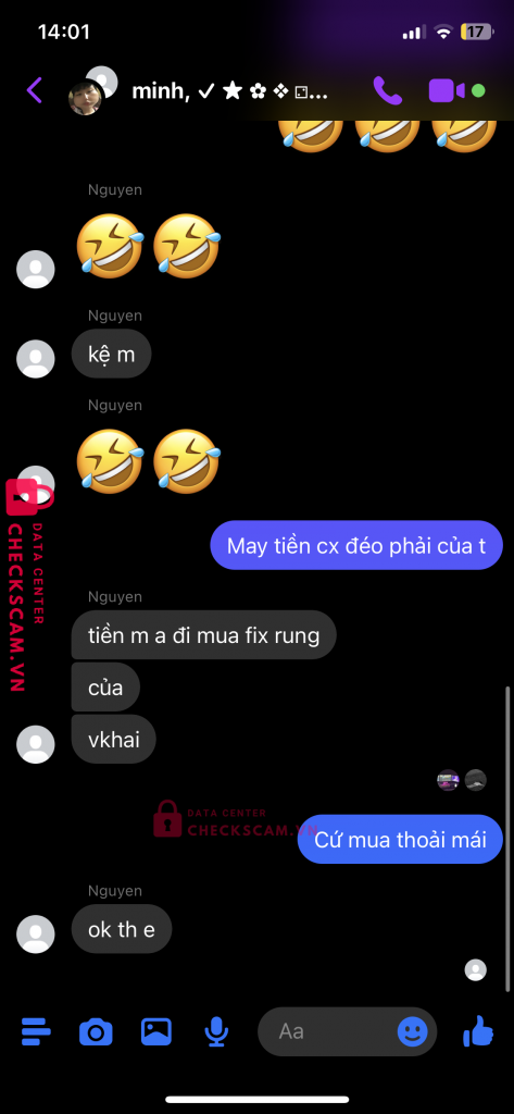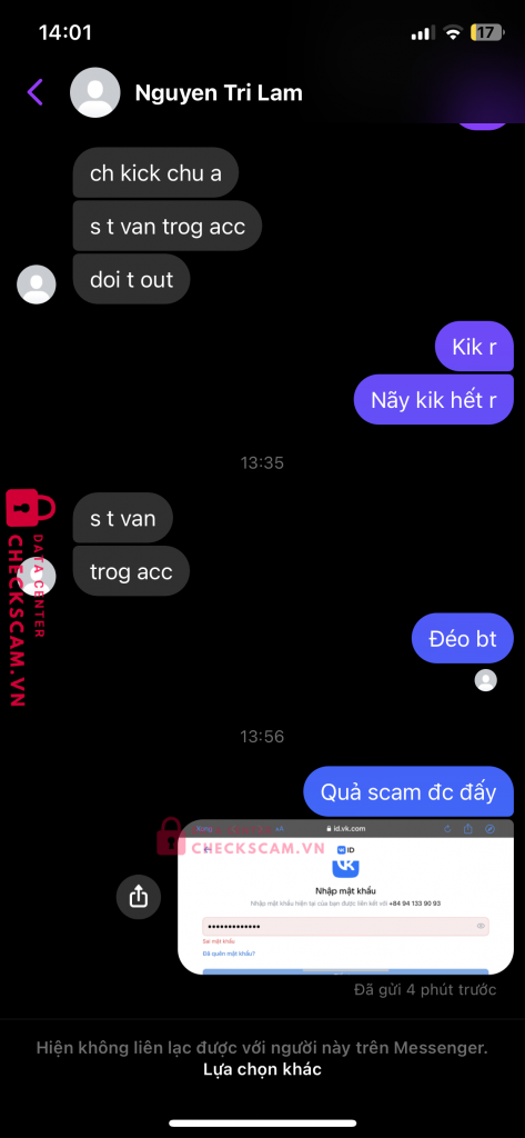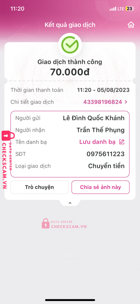 Scammer Alert: Trần thế phụng Reported: November 16, 2024 Scammer Information Full Name: Trần thế phụng Phone Number: 0975611223 Payment Gate: Momo Payment Account: 0975611223 Category: Marketplace scams Source: Checkscam Evidence Files Report Description Tôi mua acc ff qua tv của box tôi và tôi đã bị lừa đảo 1 cách trắng trợn Comments Your comment Add Comment No comments yet. Be the first to share your experience with this scammer.