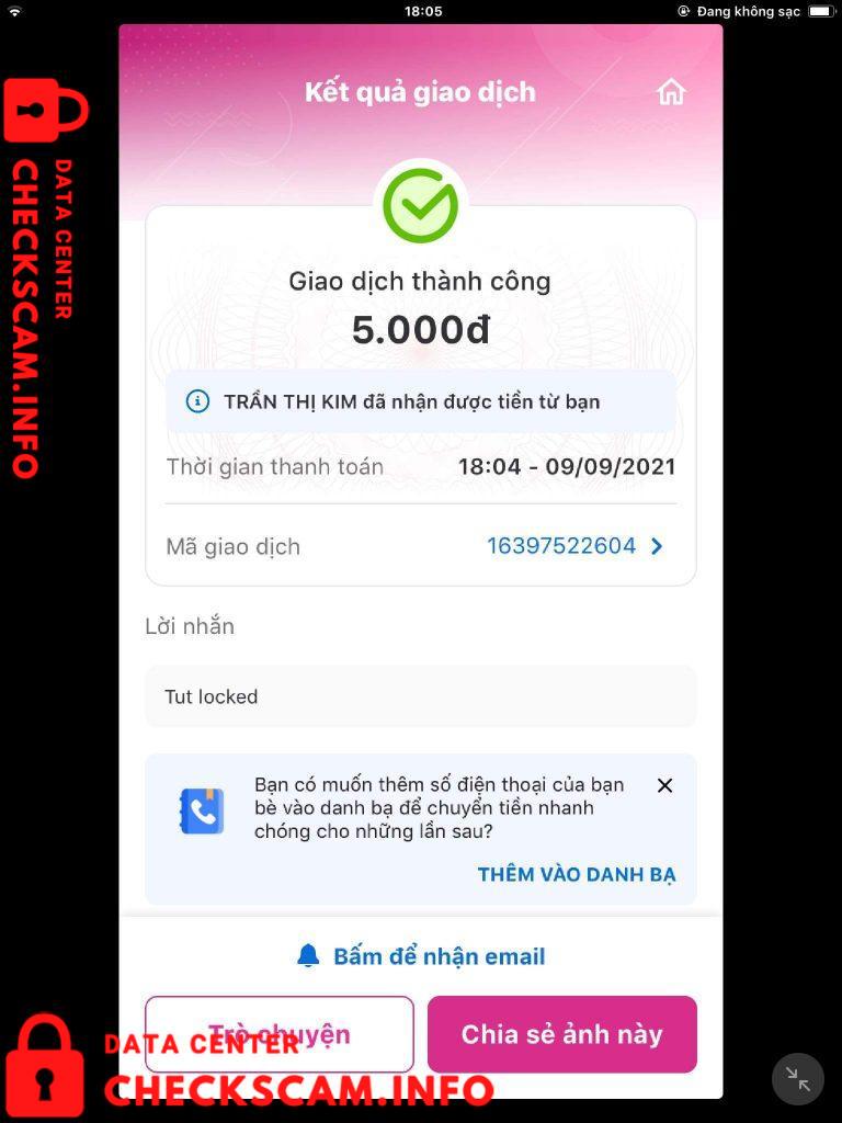 Scammer Alert: Trần Thị Kim Reported: November 16, 2024 Scammer Information Full Name: Trần Thị Kim Phone Number: 081886803 Payment Gate: 0818868031 Payment Account: 0818868031 Category: Marketplace scams Source: Checkscam Evidence Files Report Description Scam 5k tut locked fake Comments Your comment Add Comment No comments yet. Be the first to share your experience with this scammer.