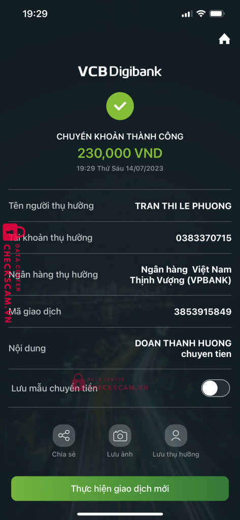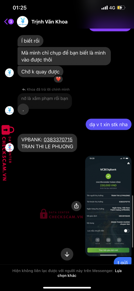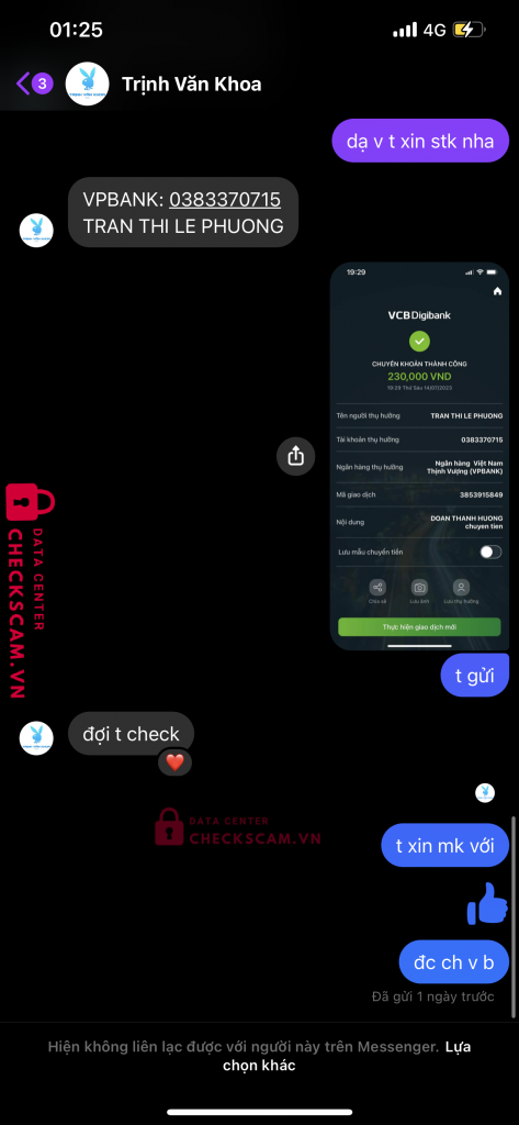 Scammer Alert: TRAN THI LE PHUONG Reported: November 16, 2024 Scammer Information Full Name: TRAN THI LE PHUONG Payment Gate: VPBANK Payment Account: 0383370715 Category: Marketplace scams Source: Checkscam Evidence Files Report Description cho that Comments Your comment Add Comment No comments yet. Be the first to share your experience with this scammer.