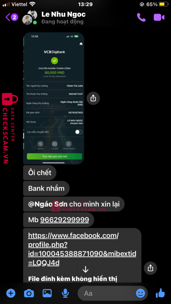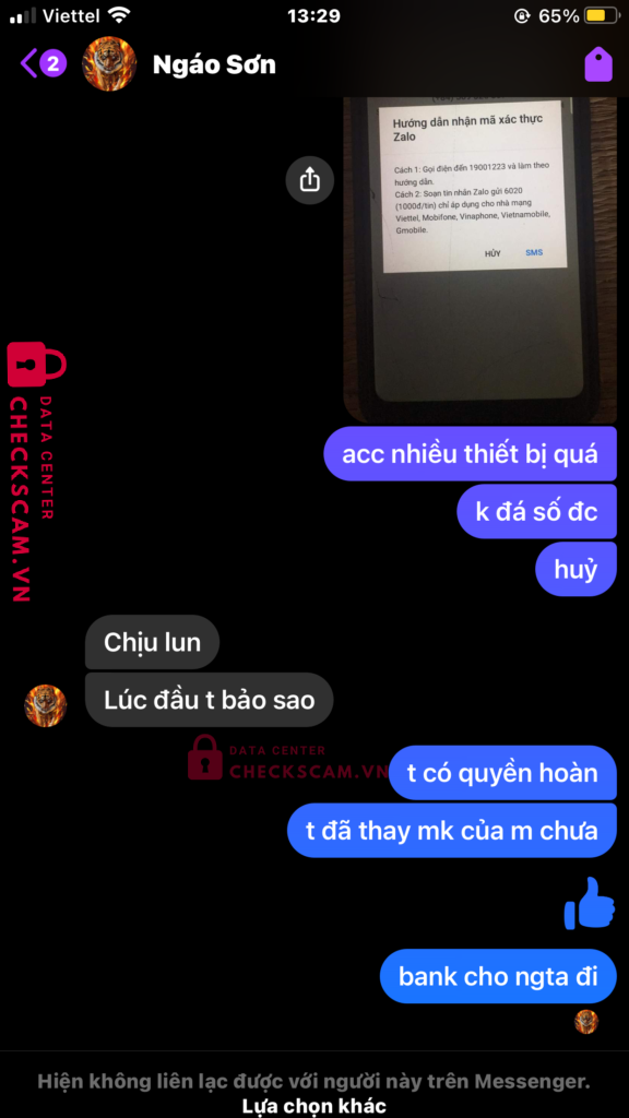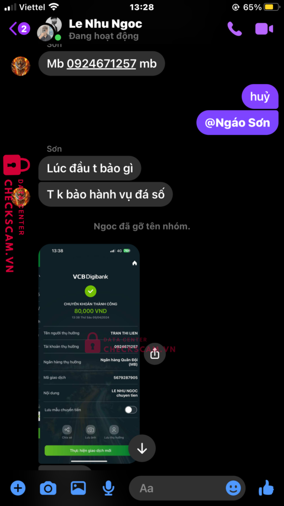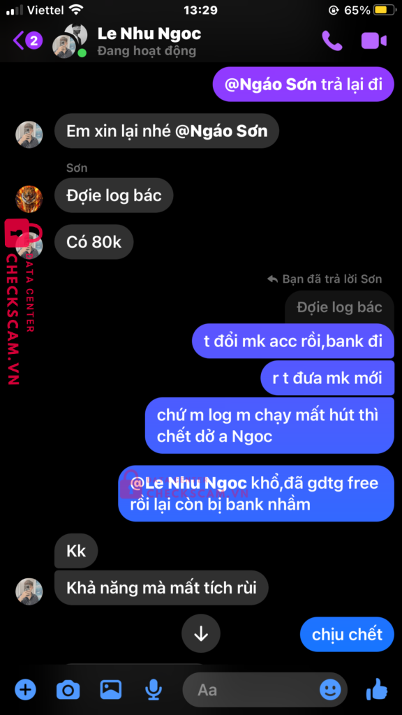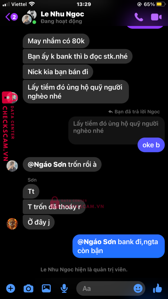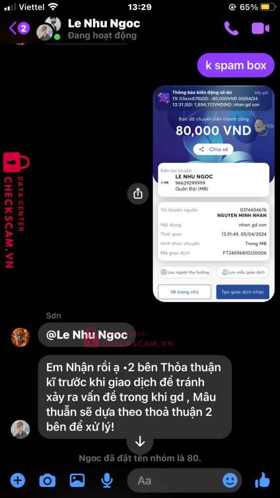 Mình có gd mua acc của thằng này và có gdtg qua Ad Le Nhu Ngoc,mình bank tiền cho ad rồi,mình vào check acc,thấy acc ko đủ yêu cầu của mình nên mình xác nhận huỷ gd,nhưng Ad Le Nhu Ngoc lại bank nhầm cho thằng kia,xong nó scam 80k luôn,nó ko trả,rồi nó out box và đã block mình