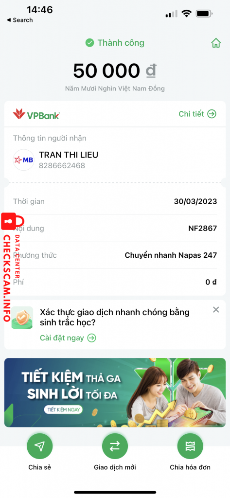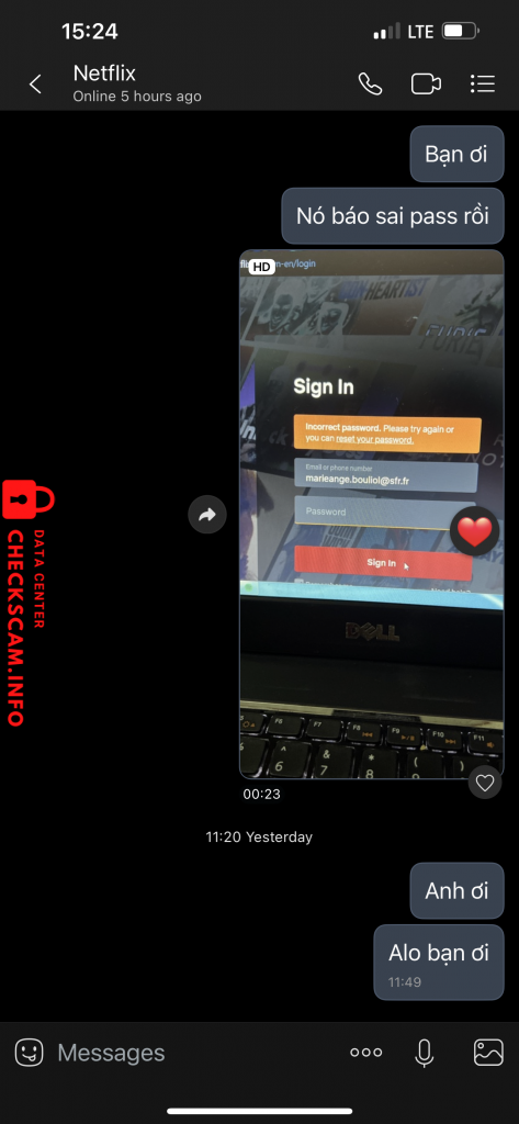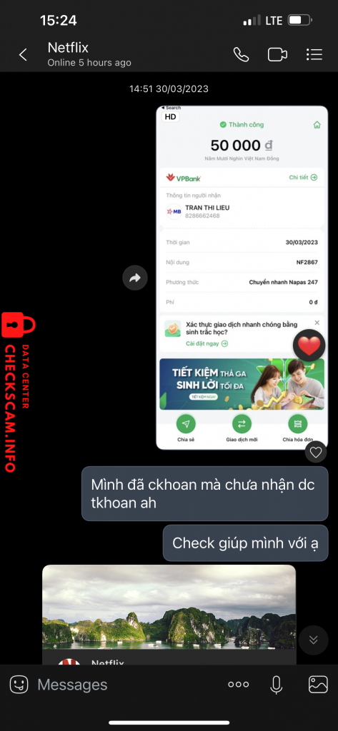 Scammer Alert: Tran Thi Lieu Reported: November 16, 2024 Scammer Information Full Name: Tran Thi Lieu Phone Number: 0879371770 Payment Gate: MB Bank Payment Account: 8286662468 Category: Marketplace scams Source: Checkscam Evidence Files Report Description Nó dùng trang netflixviet. Store để lừa đảo mua tkhoan netflix sau đó không đăng nhập được Comments Your comment Add Comment No comments yet. Be the first to share your experience with this scammer.