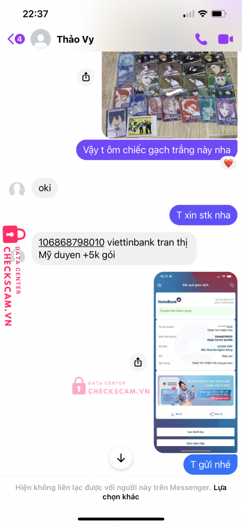 Scammer Alert: Trần Thị Mỹ Duyên Reported: November 16, 2024 Scammer Information Full Name: Trần Thị Mỹ Duyên Payment Gate: Vietinbank Payment Account: 106868798010 Category: Marketplace scams Source: Checkscam Evidence Files Report Description Lừa tiền- ck xong thì chặn mình Comments Your comment Add Comment No comments yet. Be the first to share your experience with this scammer.