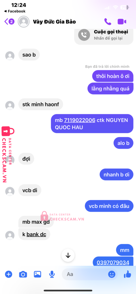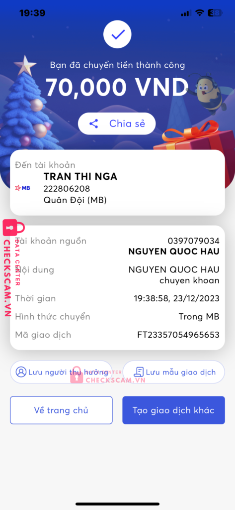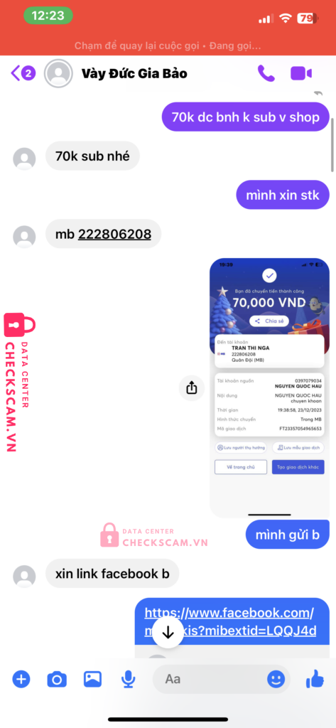 Scammer Alert: TRAN THI NGA Reported: November 16, 2024 Scammer Information Full Name: TRAN THI NGA Payment Gate: mb bank Payment Account: 222806208 Category: Marketplace scams Source: Checkscam Evidence Files Report Description vày đức gia bảo scam buff sub người theo dõi Comments Your comment Add Comment No comments yet. Be the first to share your experience with this scammer.