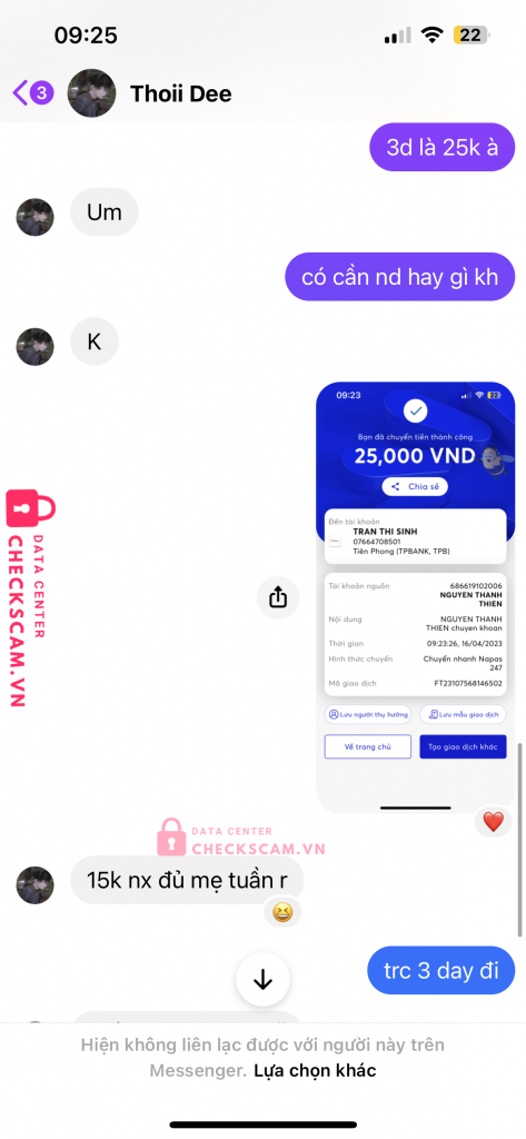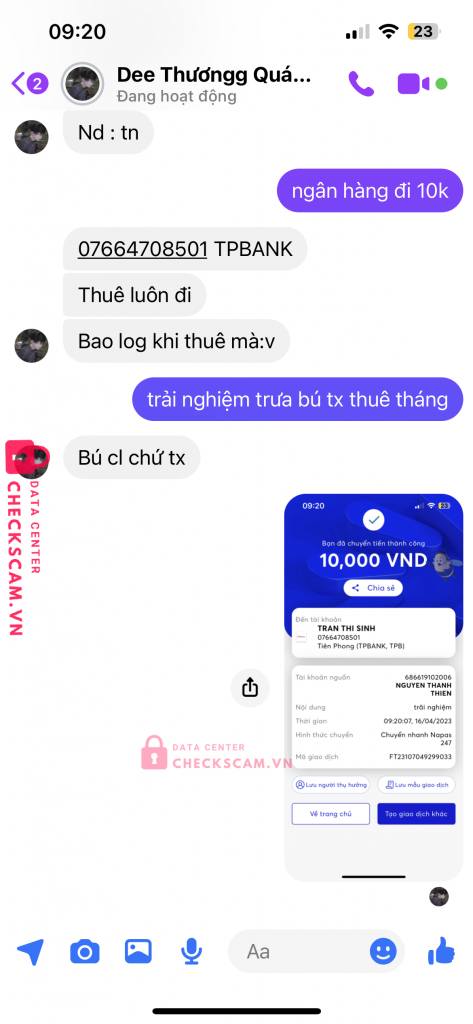 Scammer Alert: Trần Thi Sinh Reported: November 16, 2024 Scammer Information Full Name: Trần Thi Sinh Payment Gate: TP Bank Payment Account: 07664708501 Category: Marketplace scams Source: Checkscam Evidence Files Report Description Scam bán acc lq bank tiền ròi block Comments Your comment Add Comment No comments yet. Be the first to share your experience with this scammer.