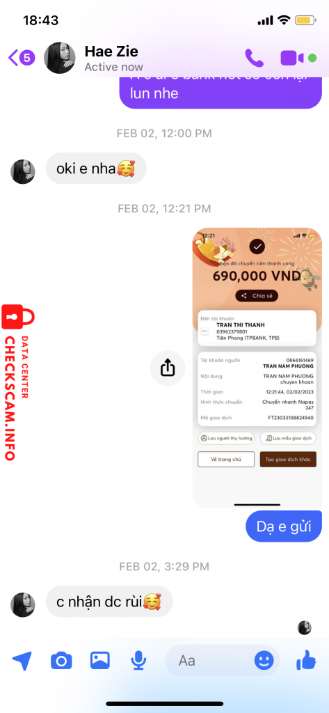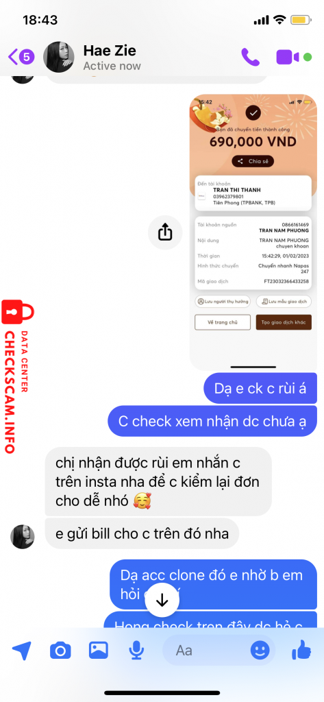 Scammer Alert: Tran thi thanh Reported: November 16, 2024 Scammer Information Full Name: Tran thi thanh Payment Gate: Tp bank Payment Account: 03962379801 Category: Marketplace scams Source: Checkscam Evidence Files Report Description Chuyển khoản order hàng xong nt không trả lời Comments Your comment Add Comment No comments yet. Be the first to share your experience with this scammer.