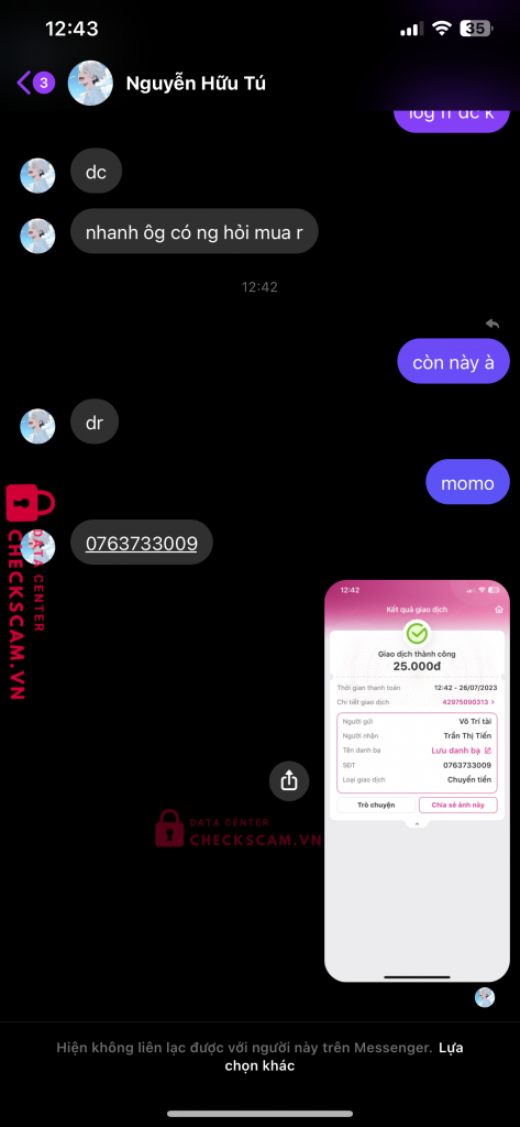 Scammer Alert: Trần Thị Tiến Reported: November 16, 2024 Scammer Information Full Name: Trần Thị Tiến Phone Number: 0763733009 Payment Gate: MoMo Payment Account: 0763733009 Category: Marketplace scams Source: Checkscam Evidence Files Report Description 25k cũng scam đói quá mà Comments Your comment Add Comment No comments yet. Be the first to share your experience with this scammer.