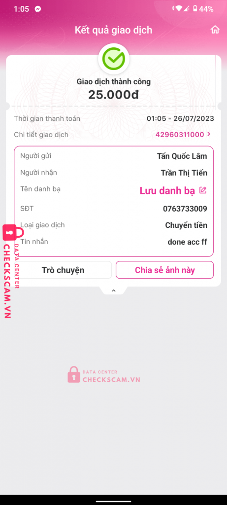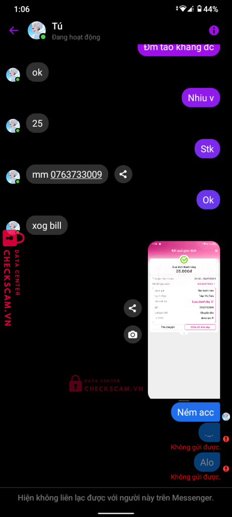 Scammer Alert: Trần Thị Tiến Reported: November 16, 2024 Scammer Information Full Name: Trần Thị Tiến Phone Number: 0763733009 Payment Gate: Momo Payment Account: 0763733009 Category: Marketplace scams Source: Checkscam Evidence Files Report Description 25k Mà Cũng Scam:V Nể Comments Your comment Add Comment No comments yet. Be the first to share your experience with this scammer.
