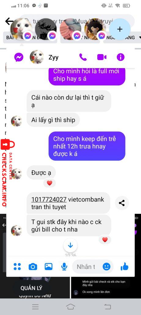 Scammer Alert: Tran Thi Tuyet Reported: November 16, 2024 Scammer Information Full Name: Tran Thi Tuyet Payment Gate: Vietcombank Payment Account: 1017724027 Category: Marketplace scams Source: Checkscam Evidence Files Report Description Scammer, profile từng bị phốt trên gr nhiều lần nhưng vì đổi tên, đổi cả bank và có bài check ut nên dễ dàng lừa đảo người cả tin không check kỹ Comments Your comment Add Comment No comments yet. Be the first to share your experience with this scammer.