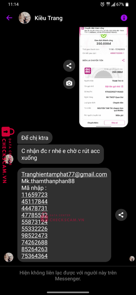 Scammer Alert: Tran thi vi Reported: November 16, 2024 Scammer Information Full Name: Tran thi vi Payment Gate: Mb Payment Account: 9704229327196460 Category: Marketplace scams Source: Checkscam Evidence Files Report Description Adm gr 300k fl scam acc ff 350k Comments Your comment Add Comment No comments yet. Be the first to share your experience with this scammer.