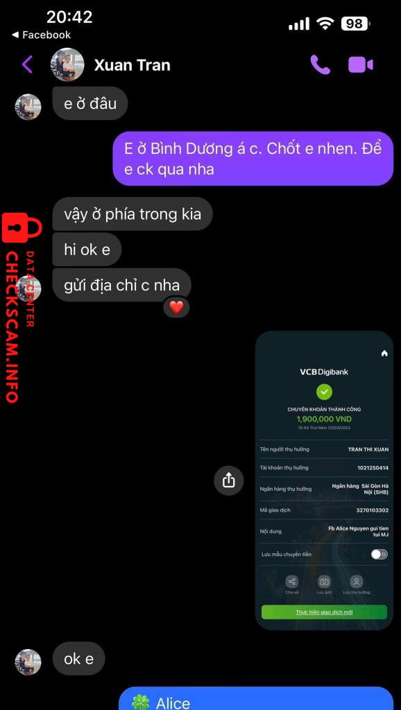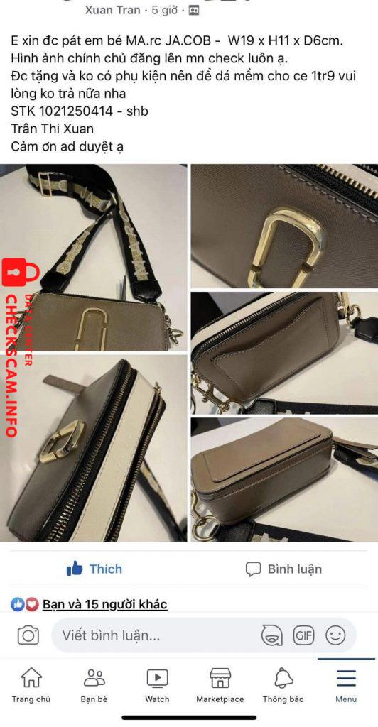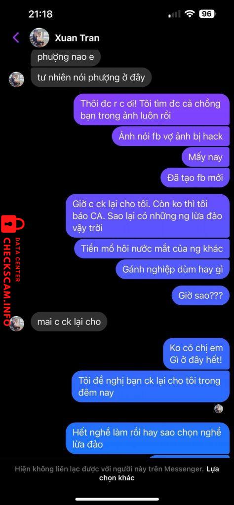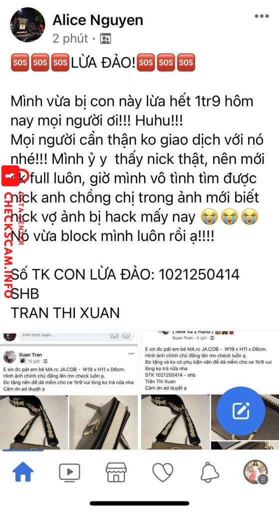 Scammer Alert: TRAN THI XUAN Reported: November 16, 2024 Scammer Information Full Name: TRAN THI XUAN Payment Gate: Shb Payment Account: 1021250414 Category: Marketplace scams Source: Checkscam Evidence Files Report Description Lừa đảo liên quan về túi xách và nữ trang. Comments Your comment Add Comment No comments yet. Be the first to share your experience with this scammer.