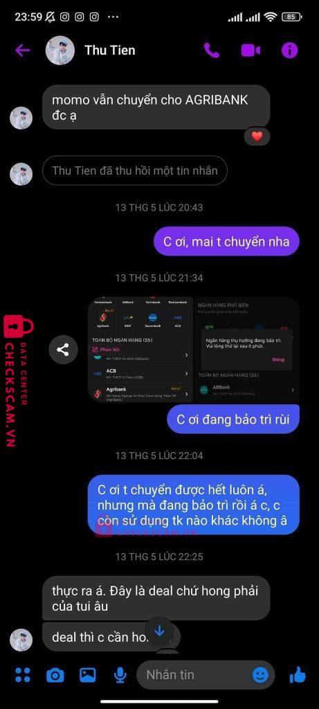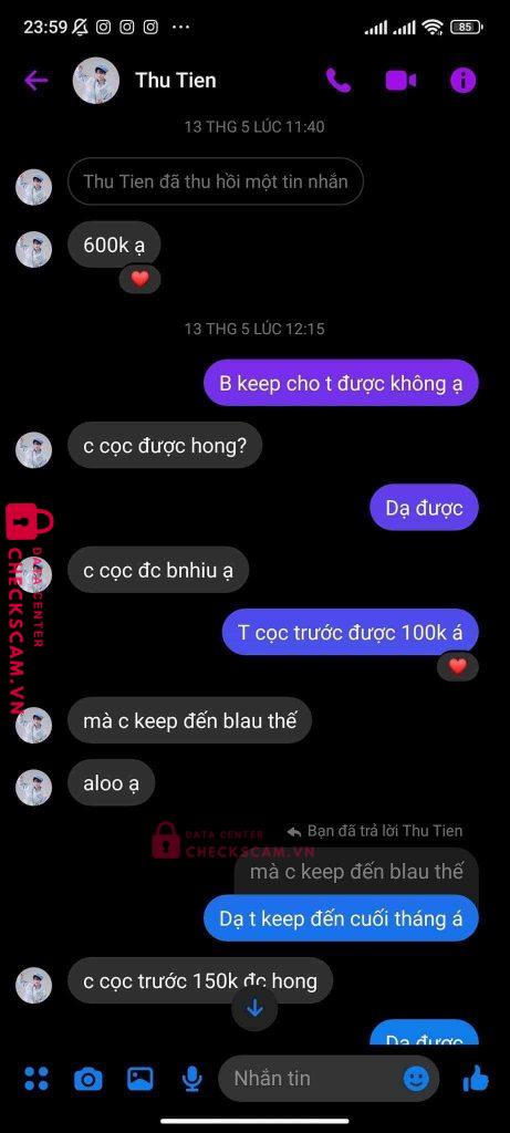 Giả danh người khác để lừa đảo, lấy video check doll của người khác bảo hàng deal. Chuyển khoản xong rep tin nhắn chậm =)) thu hồi luôn stk nhưng t có lưu lại rồi:) nói chung coi chừng nhỏ này nha mọi người ??