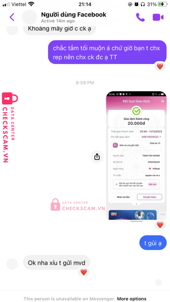 Scammer Alert: TRAN THU HUONG Reported: November 16, 2024 Scammer Information Full Name: TRAN THU HUONG Payment Gate: vp bank Payment Account: 0369346329 Category: Marketplace scams Source: Checkscam Evidence Files Report Description tôi mua đồ của họ và tôi hẹn hôm nay chuyển khoản và sau khi chuyển khoản tôi đã bị người ta chặn mess và ko gửi hàng cho tôi Comments Your comment Add Comment No comments yet. Be the first to share your experience with this scammer.