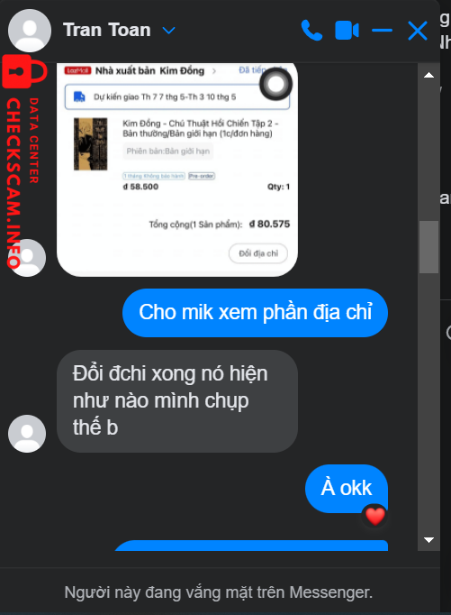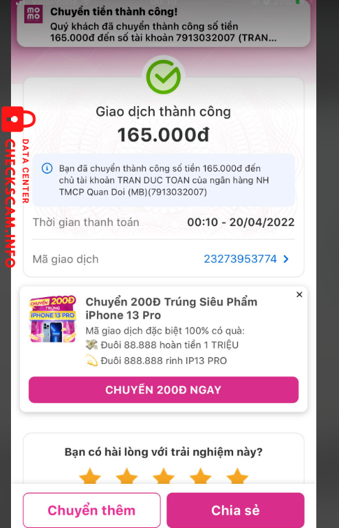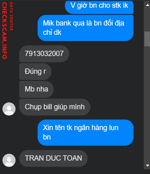 Scammer Alert: Tran Toan Reported: November 16, 2024 Scammer Information Full Name: Tran Toan Payment Gate: MB bank Payment Account: 7913032007 Category: Marketplace scams Source: Checkscam Evidence Files Report Description scam 165k :((( Comments Your comment Add Comment No comments yet. Be the first to share your experience with this scammer.