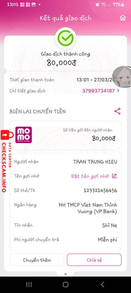 Scammer Alert: TRAN TRUNG HIEU Reported: November 16, 2024 Scammer Information Full Name: TRAN TRUNG HIEU Payment Gate: vpbank Payment Account: 123321456456 Category: Marketplace scams Source: Checkscam Evidence Files Report Description Mua hàng qua gr trên fb và bị lừa:( Comments Your comment Add Comment No comments yet. Be the first to share your experience with this scammer.