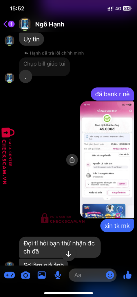 Scammer Alert: Trần Trương Gia Minh Reported: November 16, 2024 Scammer Information Full Name: Trần Trương Gia Minh Payment Gate: momo Payment Account: 0799354452 Category: Marketplace scams Source: Checkscam Evidence Files Report Description mik có đi mua 1 acc coin master 45k mà mik bank tiền xong bạn đó block mik scam mik Comments Your comment Add Comment No comments yet. Be the first to share your experience with this scammer.