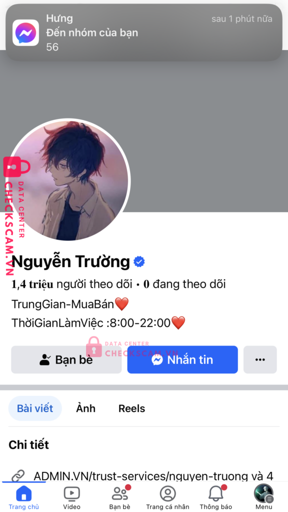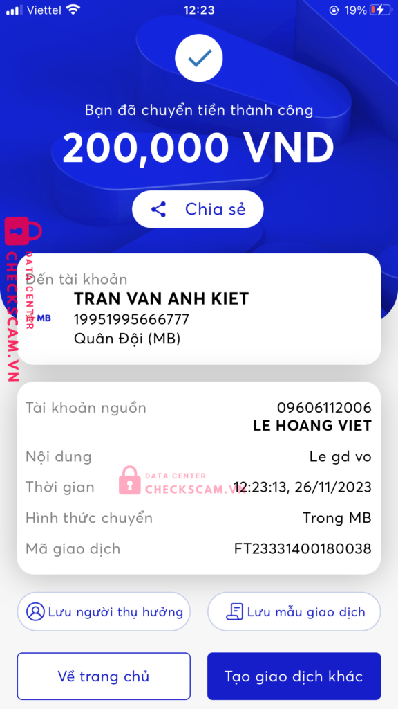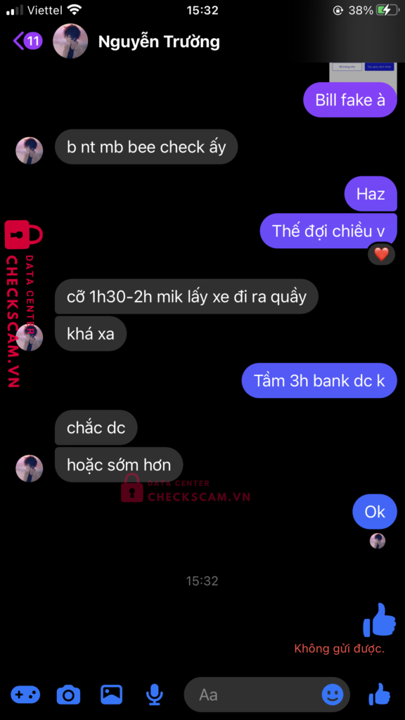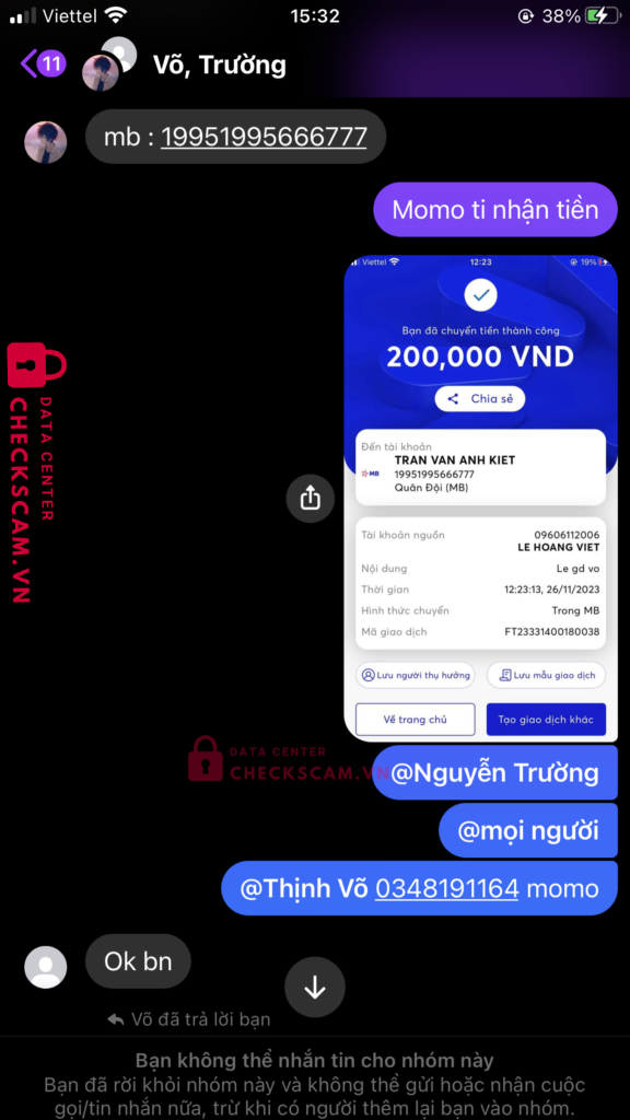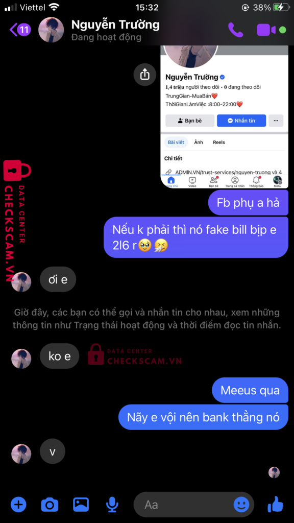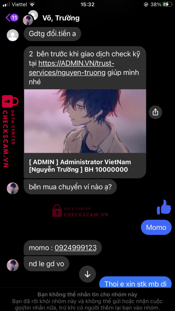 Scammer Alert: TRAN VAN ANH KIET Reported: November 16, 2024 Scammer Information Full Name: TRAN VAN ANH KIET Payment Gate: Mb Bank Payment Account: 19951995666777 Category: Marketplace scams Source: Checkscam Evidence Files Report Description Scam giả mạo Nguyễn Trường Comments Your comment Add Comment No comments yet. Be the first to share your experience with this scammer.