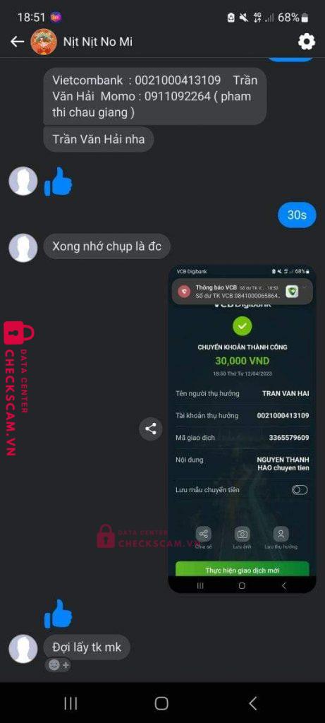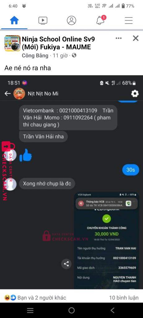 Scammer Alert: TRAN VAN HAI Reported: November 16, 2024 Scammer Information Full Name: TRAN VAN HAI Payment Gate: Vietcombank Payment Account: 0021000413109 Category: Marketplace scams Source: Checkscam Evidence Files Report Description Lừa đảo bán nick game, chuyển tiền xong block Comments Your comment Add Comment No comments yet. Be the first to share your experience with this scammer.