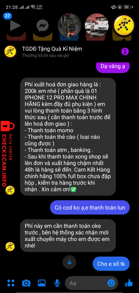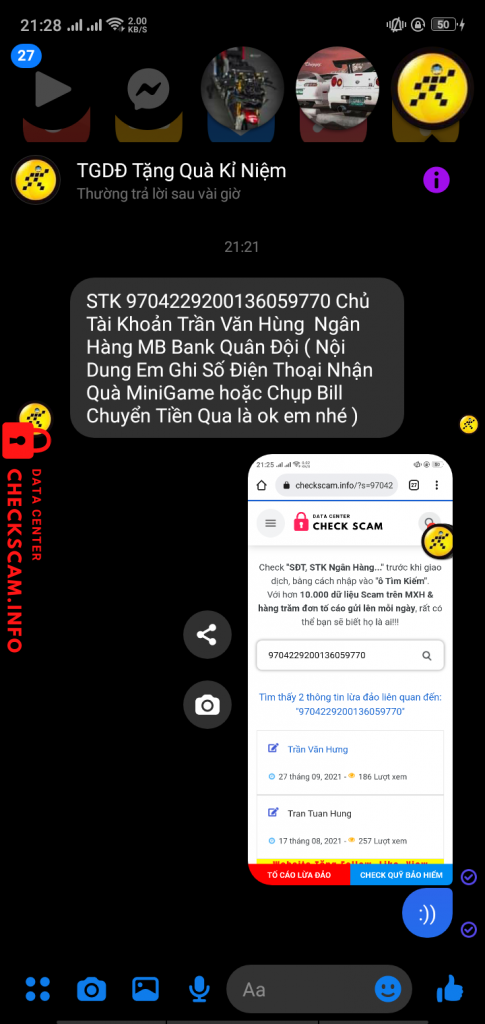 Scammer Alert: Trần Văn Hùng Reported: November 16, 2024 Scammer Information Full Name: Trần Văn Hùng Payment Gate: Mb bank ( Quân đội ) Payment Account: 9704229200136059770 Category: Marketplace scams Source: Checkscam Evidence Files Report Description Tố cáo vụ chuyển khoản lừa iPhone 12prm free Comments Your comment Add Comment No comments yet. Be the first to share your experience with this scammer.