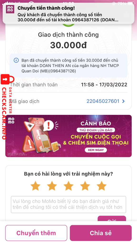 Scammer Alert: Trần Văn Minh Reported: November 16, 2024 Scammer Information Full Name: Trần Văn Minh Phone Number: 0383696830 Payment Gate: MB Bank Payment Account: 0964387126 Category: Marketplace scams Source: Checkscam Evidence Files Report Description Nhận Tiền Mua Thẻ Đổi tên rồi chặn Comments Your comment Add Comment No comments yet. Be the first to share your experience with this scammer.