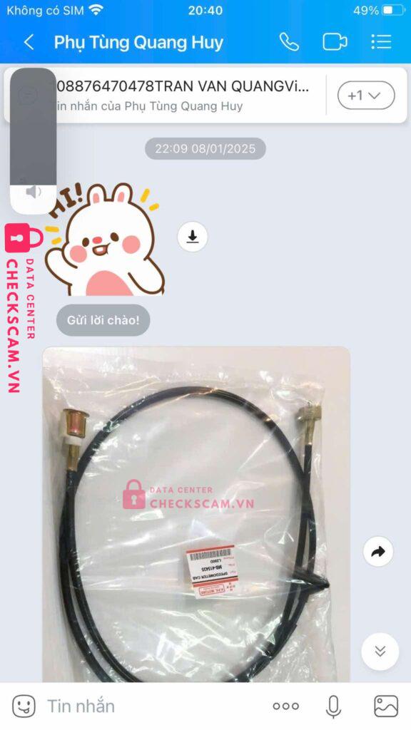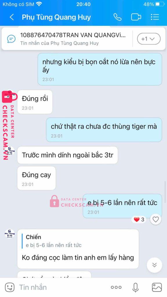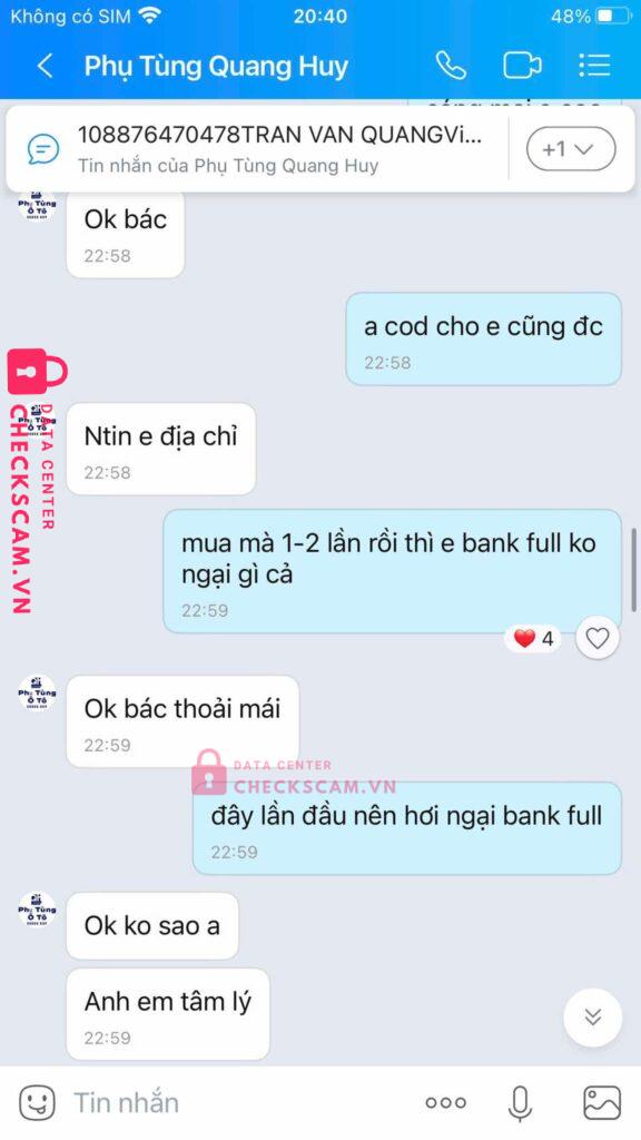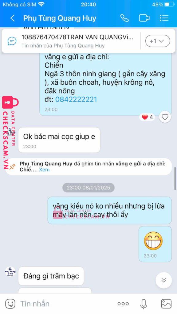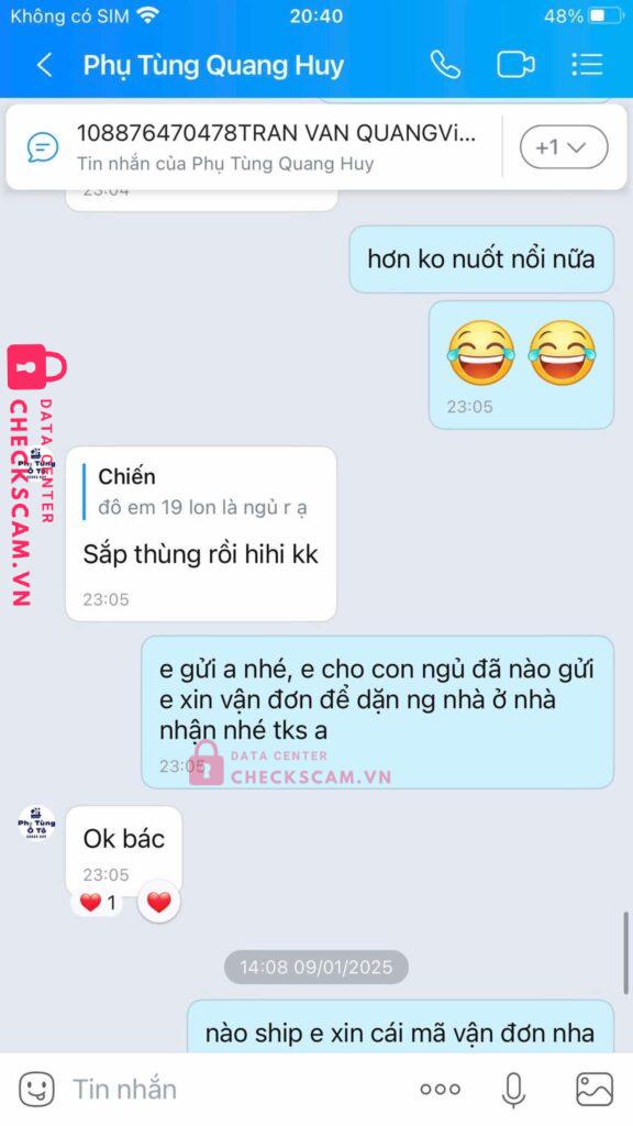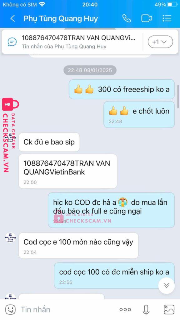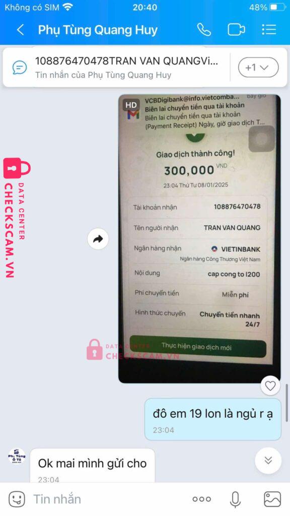Scammer Alert: TRAN VAN QUANG Reported: March 7, 2025 Scammer Information Full Name: TRAN VAN QUANG Payment Gate: Vietinbank Payment Account: 108876470478 Category: Marketplace scams Source: Checkscam Evidence Files Report Description Lừa đảo bán phụ tùng ô tô Comments Your comment Add Comment No comments yet. Be the first to share your experience with this scammer.