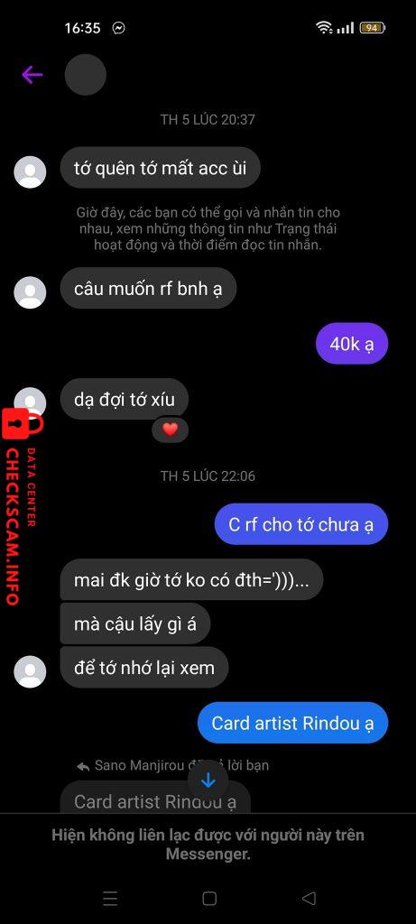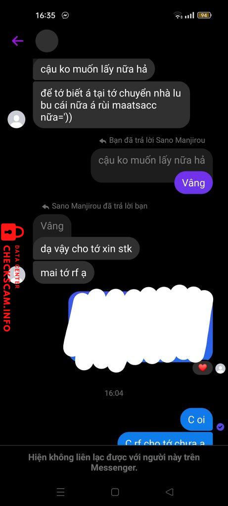 Vào ngày 29/8 tớ có đăng một bài #Hỏi#Tìm như hình .Ngày 31/9 có một bn nói với tớ là bn Bánh Cá bị mất acc , acc mới của bn ấy là Ghệ Sano Manjiro . Tớ có vào ib , sang ngày 1/9 thấy bn ấy k rep nên tớ có yêu cầu c ấy rf cho tớ , c ấy bảo ” tớ quên tớ mất acc ùi ” và đồng ý rf cho tớ . Hai giờ sau tớ có vào hỏi thì c ấy hẹn mai ck vì lý do như hình . Nguyên ngày k thấy c ấy ck nên tớ vào hỏi thì bị block luôn =))) . Rồi bộ mất acc nữa hả bà dà =)))