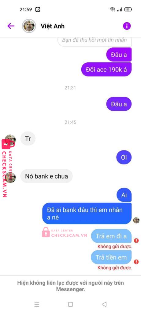 Scammer Alert: Trần việt anh Reported: November 16, 2024 Scammer Information Full Name: Trần việt anh Payment Gate: Mb bank Payment Account: 1233888231 Category: Marketplace scams Source: Checkscam Evidence Files Report Description Trần việt anh đã lấy tiền và block tôi không chịu hoàn tiền Comments Your comment Add Comment No comments yet. Be the first to share your experience with this scammer.