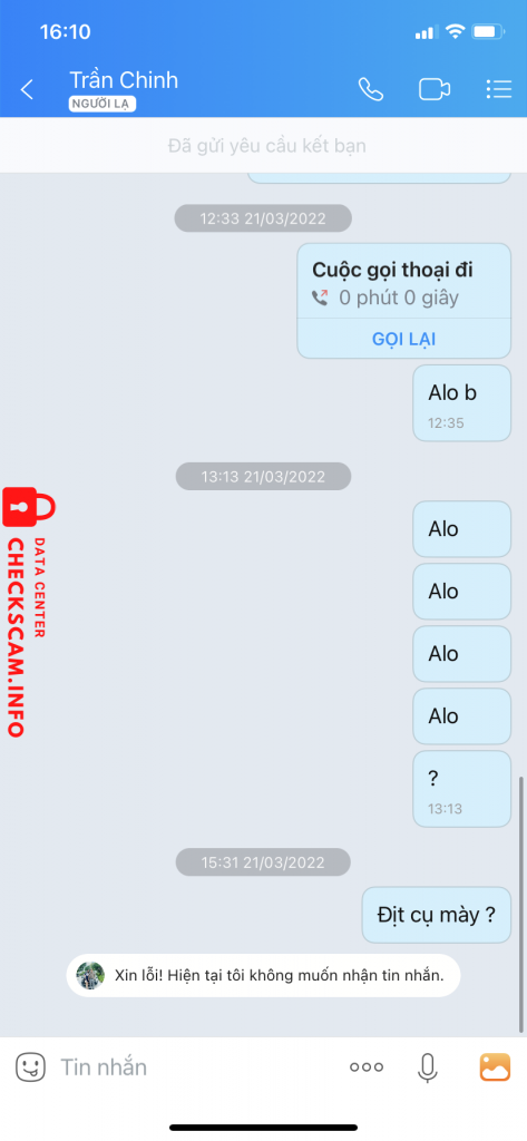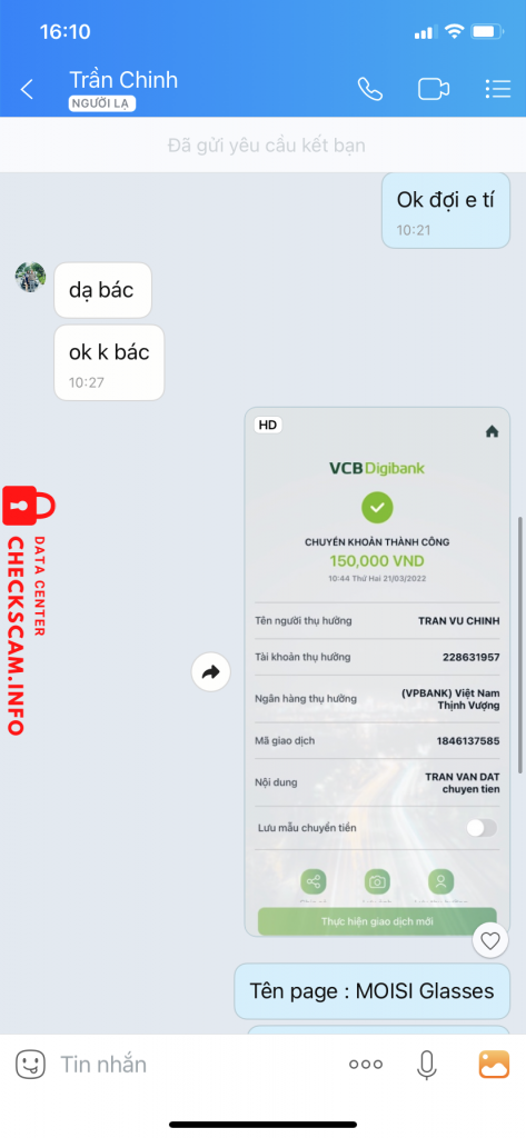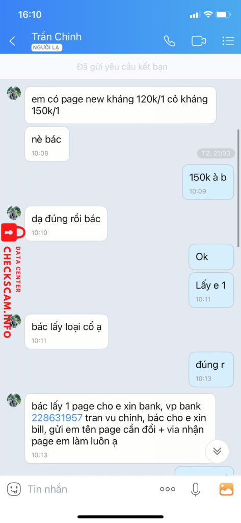 Scammer Alert: Trần vũ chinh Reported: November 16, 2024 Scammer Information Full Name: Trần vũ chinh Payment Gate: Vp bank Payment Account: 228631957 Category: Marketplace scams Source: Checkscam Evidence Files Report Description Scam bán via bm Comments Your comment Add Comment No comments yet. Be the first to share your experience with this scammer.