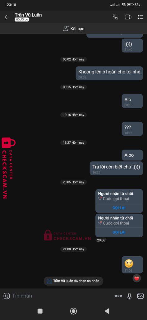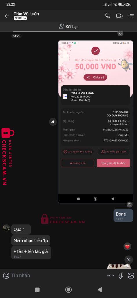 Scammer Alert: TRAN VU LUAN Reported: November 16, 2024 Scammer Information Full Name: TRAN VU LUAN Payment Gate: MB Bank Payment Account: 000323699999 Category: Marketplace scams Source: Checkscam Evidence Files Report Description Lên nhạc fb , bank rồi 2 hôm sau nhắn tin hỏi lên chưa , nó rep chưa lên ,với không lên được , tôi bảo hoàn tiền thì chặn ib Comments Your comment Add Comment No comments yet. Be the first to share your experience with this scammer.