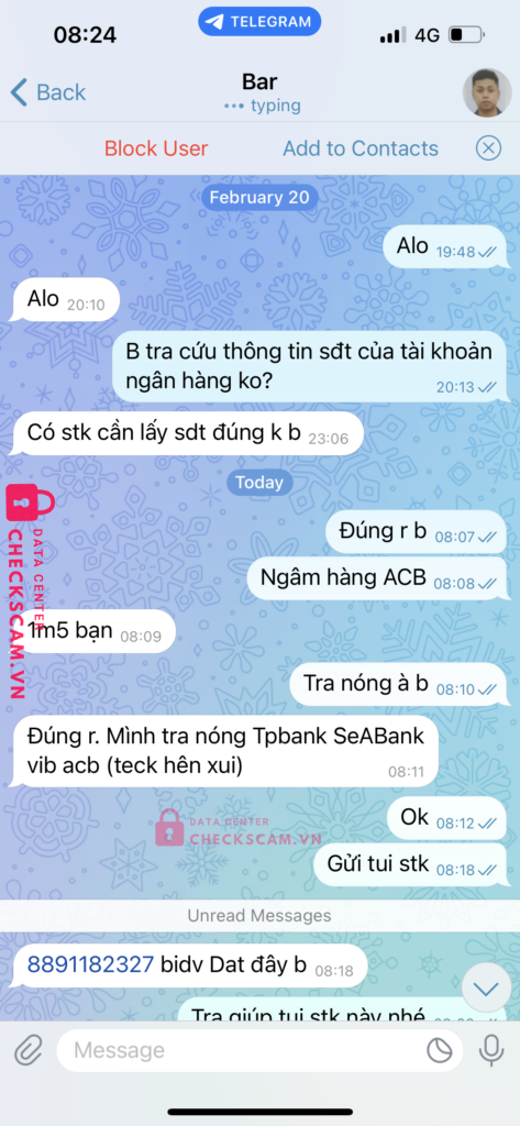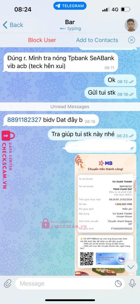 Ngày 21/4/2024, tôi có nhờ 01 người trên Telegram với địa chỉ @Bar1977 kiểm tra thông tin của 01 tài khoản ngân hàng ACB. Người đó có trao đổi là chi phí thực hiện mất 1.500.000 đồng; hứa là trong ngày sẽ gửi lại thông tin. Tôi đã tin và chuyển qua tài khoản cá nhân số tiền trên cho người với nickname là @Bar1977. Tuy nhiên, một ngày sau khi chuyển tiền nhưng không nhận được phản hồi, tôi đã biết mình bị lừa. Nhờ cộng đồng mạng, những người có tài có đức hãy tìm và xử lý giúp tôi trường hợp lừa đảo trên để không còn ai là nạn nhân nữa! Trân trọng cảm ơn!