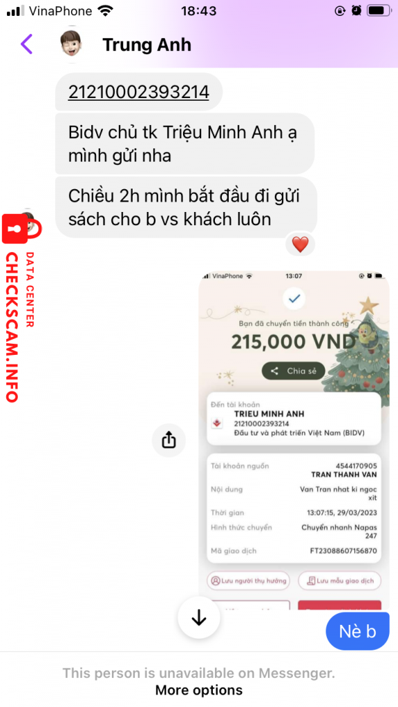 Scammer Alert: Triệu Minh Anh Reported: November 16, 2024 Scammer Information Full Name: Triệu Minh Anh Payment Gate: BIDV Payment Account: 21210002393214 Category: Marketplace scams Source: Checkscam Evidence Files Report Description Thường xuyên lừa đảo chiếm đoạt tài sản trên các hội nhóm mua bán sách Comments Your comment Add Comment No comments yet. Be the first to share your experience with this scammer.