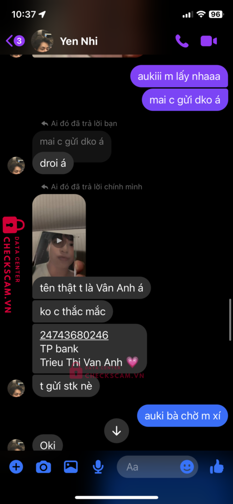 Scammer Alert: Trieu Thi Van Anh Reported: November 16, 2024 Scammer Information Full Name: Trieu Thi Van Anh Payment Gate: Tp Bank Payment Account: 24743680246 Category: Marketplace scams Source: Checkscam Evidence Files Report Description scam 140k xong xoá acc Comments Your comment Add Comment No comments yet. Be the first to share your experience with this scammer.