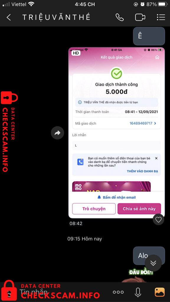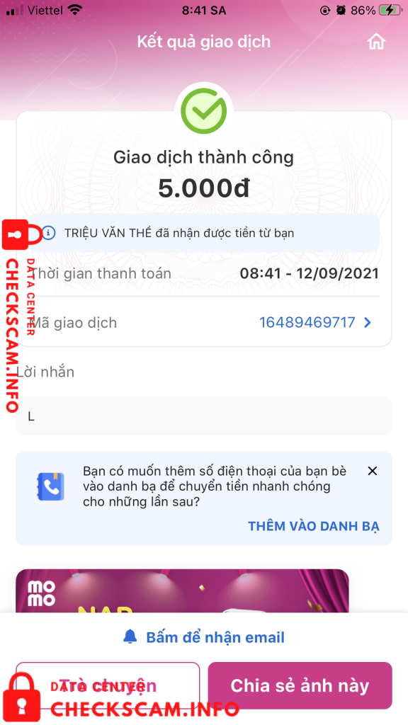 Scammer Alert: Triệu Văn Thể Reported: November 16, 2024 Scammer Information Full Name: Triệu Văn Thể Phone Number: 0343873734 Payment Gate: Ví Momo Payment Account: 0343873734 Category: Marketplace scams Source: Checkscam Evidence Files Report Description Bank tiền xong không rep inbox Comments Your comment Add Comment No comments yet. Be the first to share your experience with this scammer.