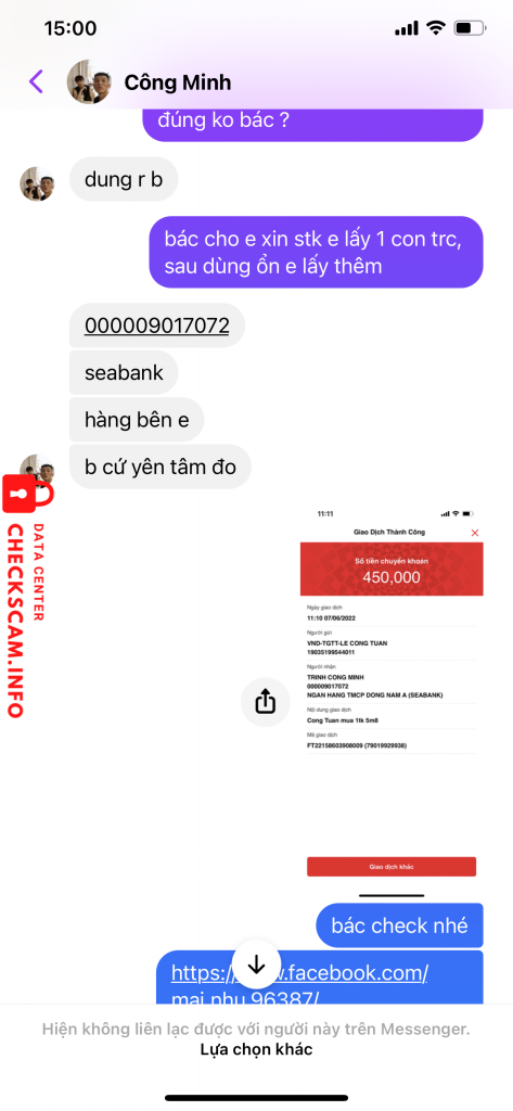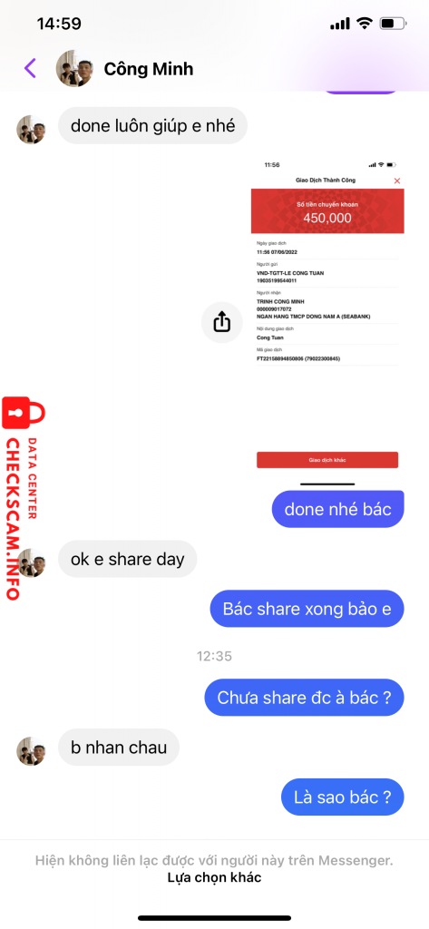 Scammer Alert: Trinh Cong Minh Reported: November 16, 2024 Scammer Information Full Name: Trinh Cong Minh Payment Gate: Seabank Payment Account: 000009017072 Category: Marketplace scams Source: Checkscam Evidence Files Report Description Scam mua tài khoản facebook Comments Your comment Add Comment No comments yet. Be the first to share your experience with this scammer.